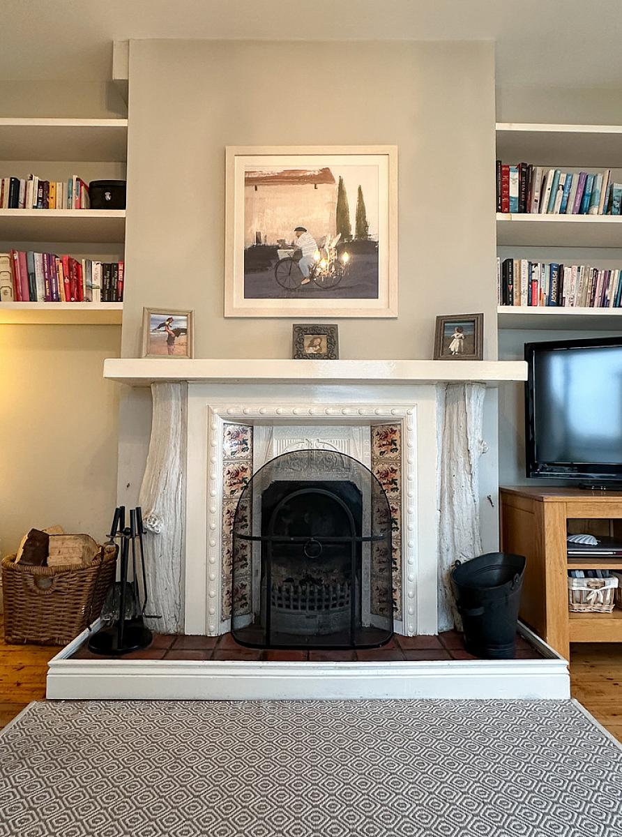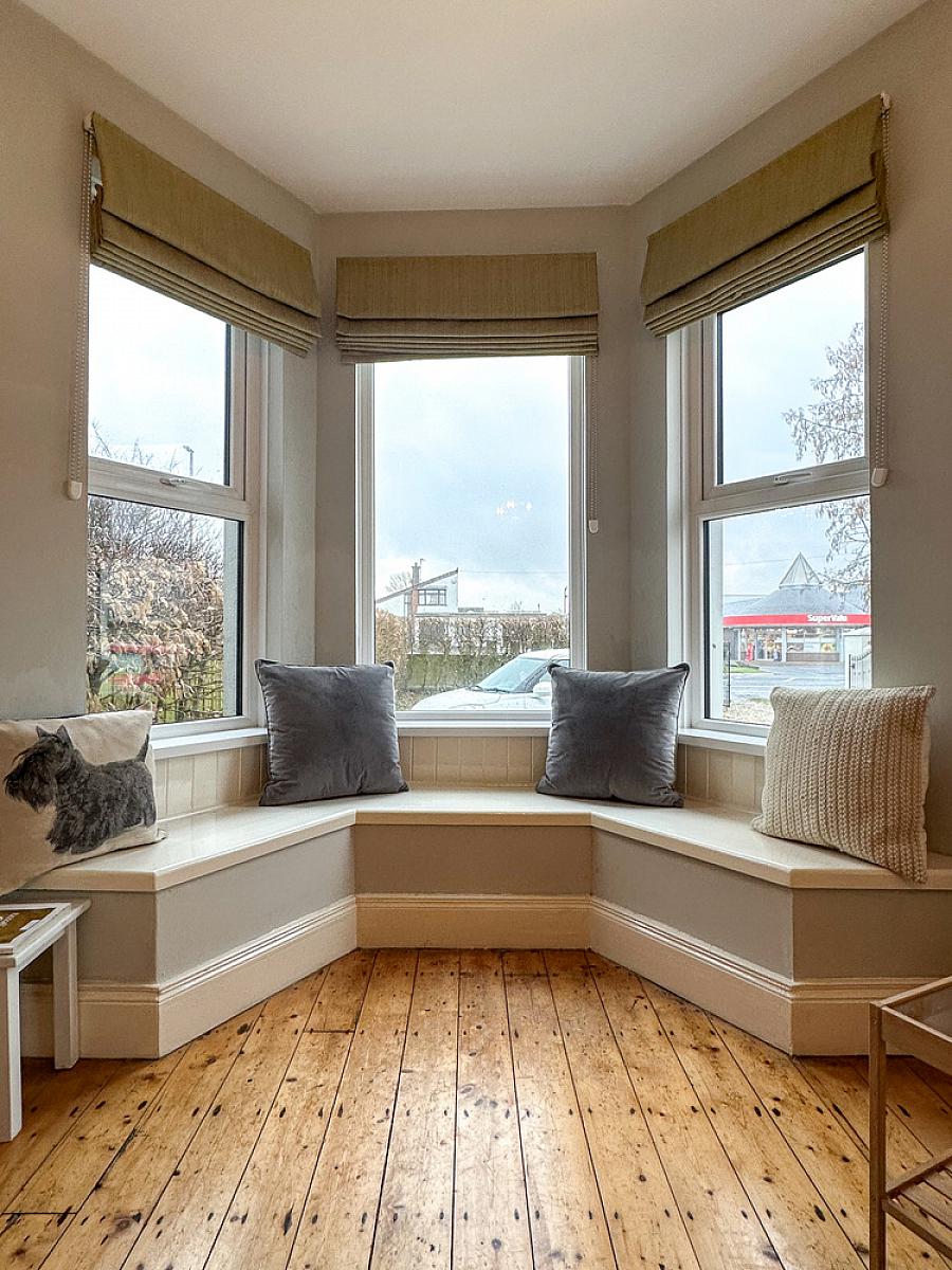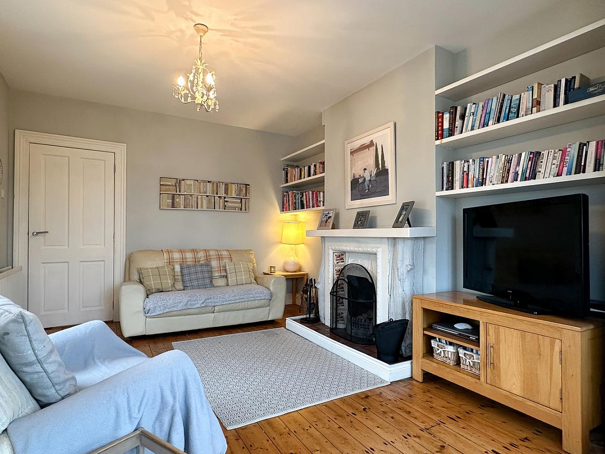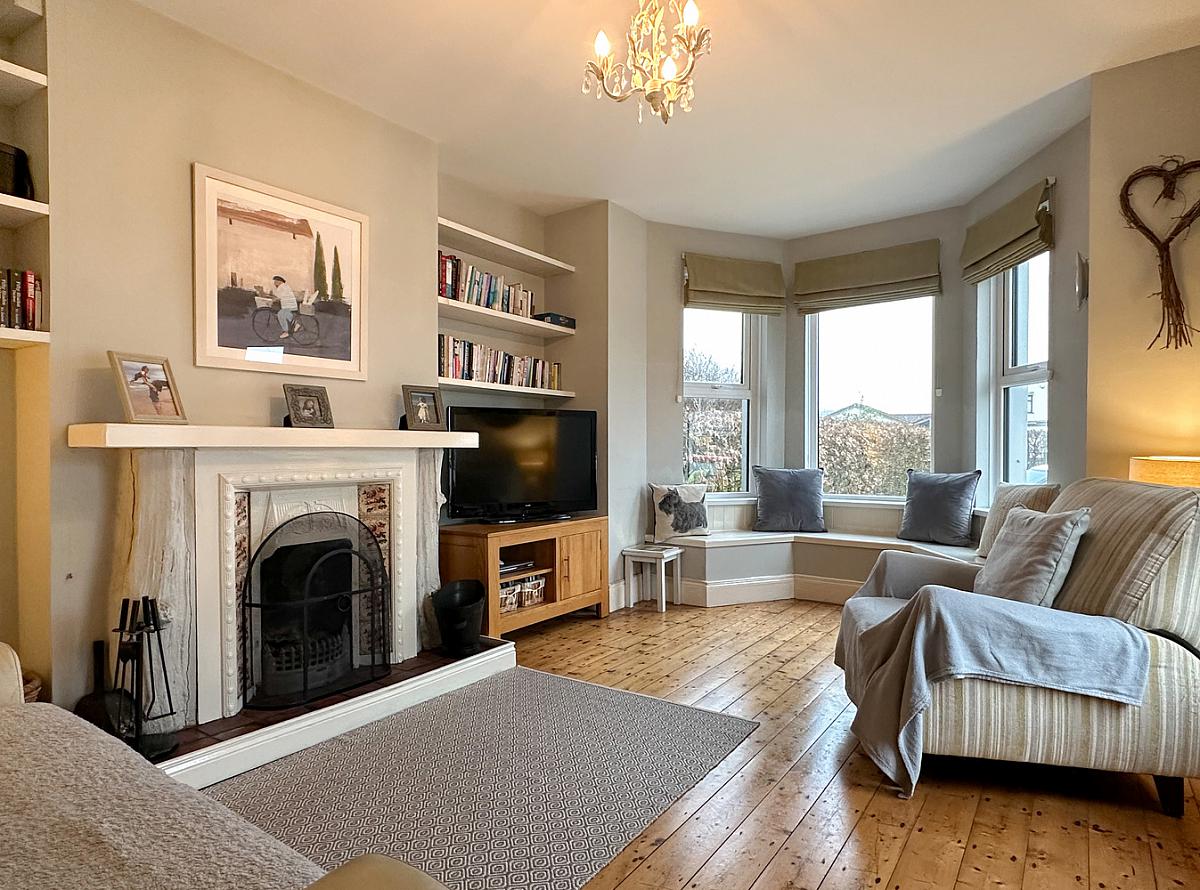including feature bay window with built-in seating, wooden surround fireplace with cast iron and tiled inset, tiled hearth, recess shelving, wooden flooring.