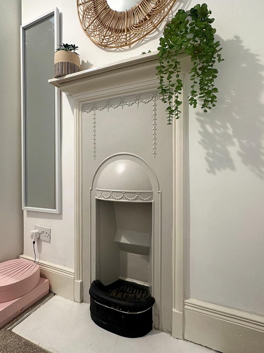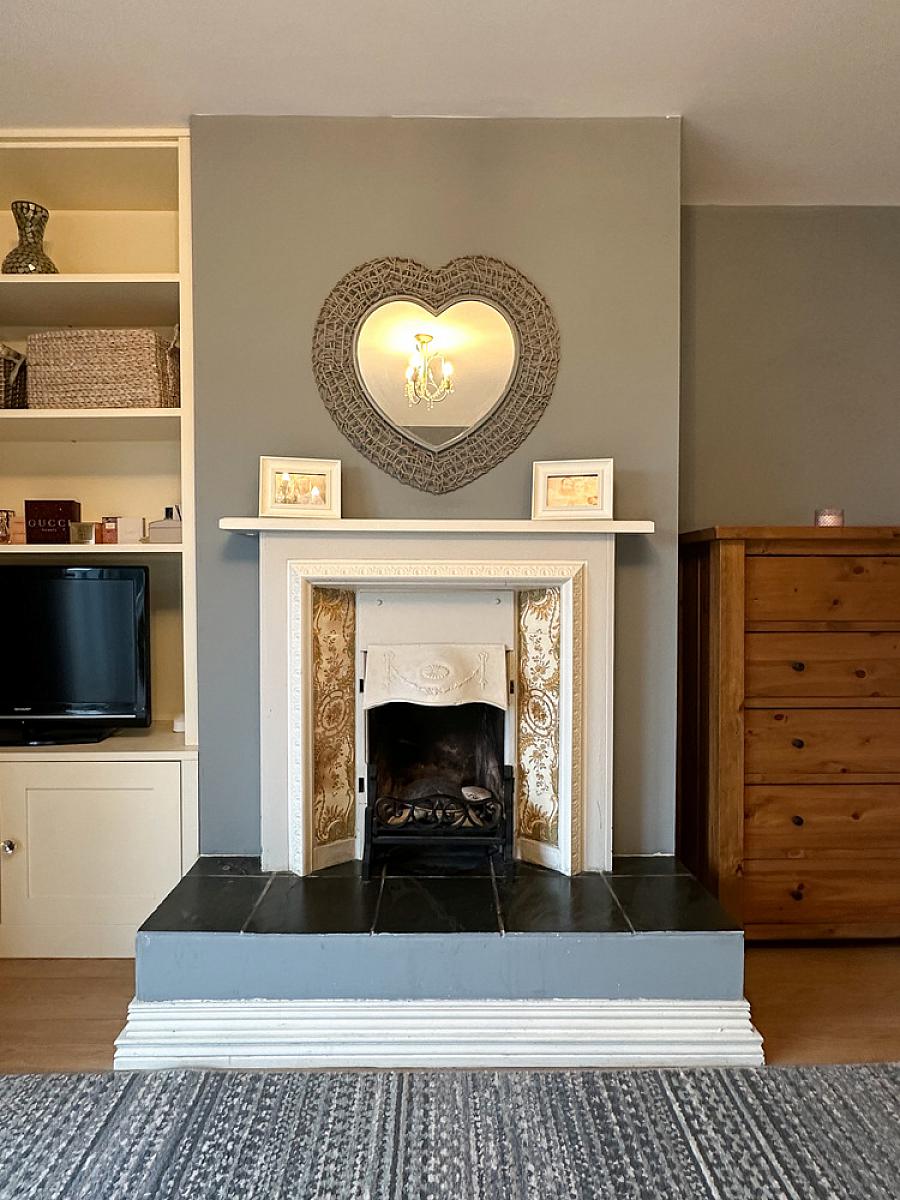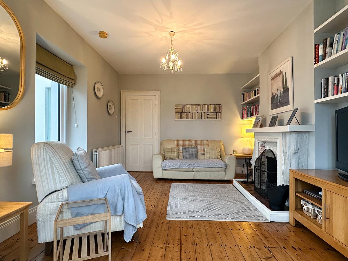 including feature bay window with built-in seating, wooden surround fireplace with cast iron and tiled inset, tiled hearth, recess shelving, wooden flooring.