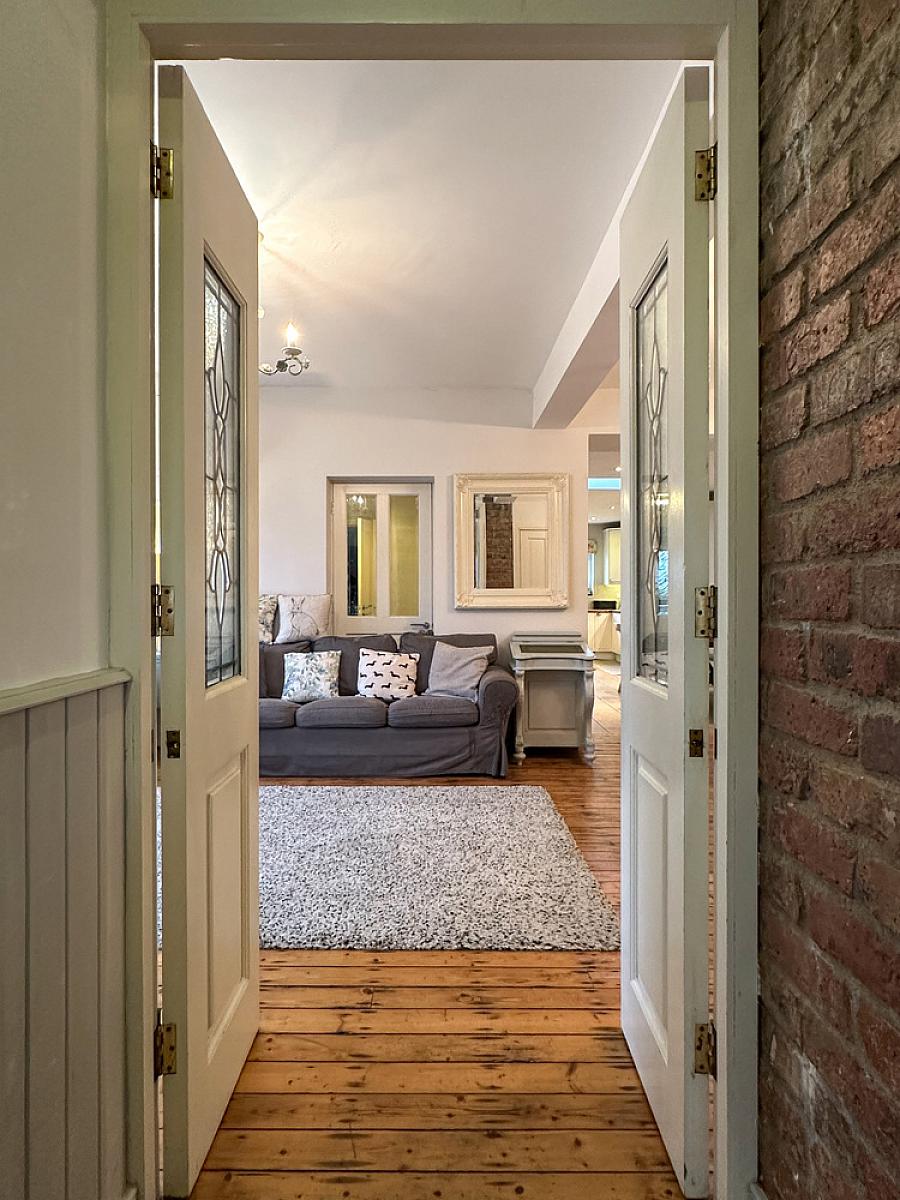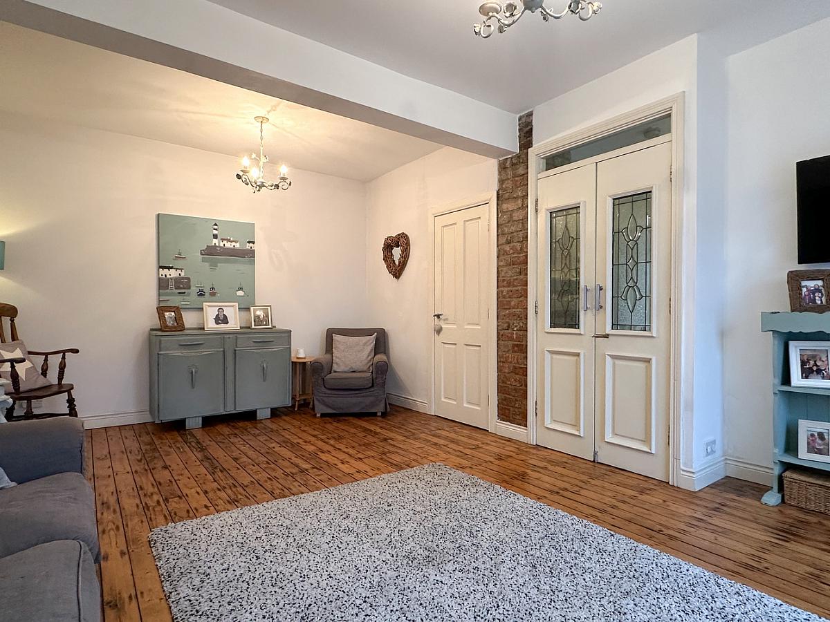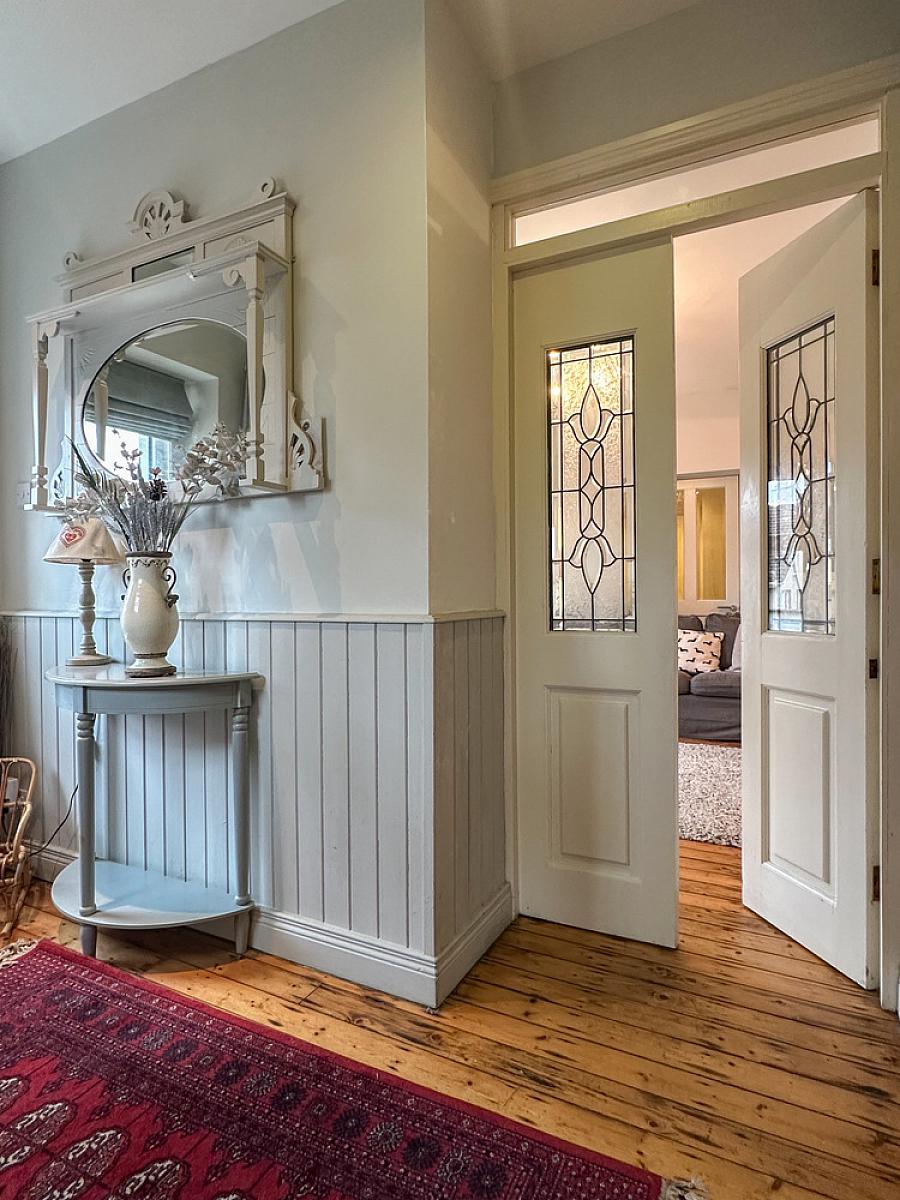 with French leaded glass panel doors from hall, wooden flooring, under stairs storage, glass panel door to rear hall. Open to: