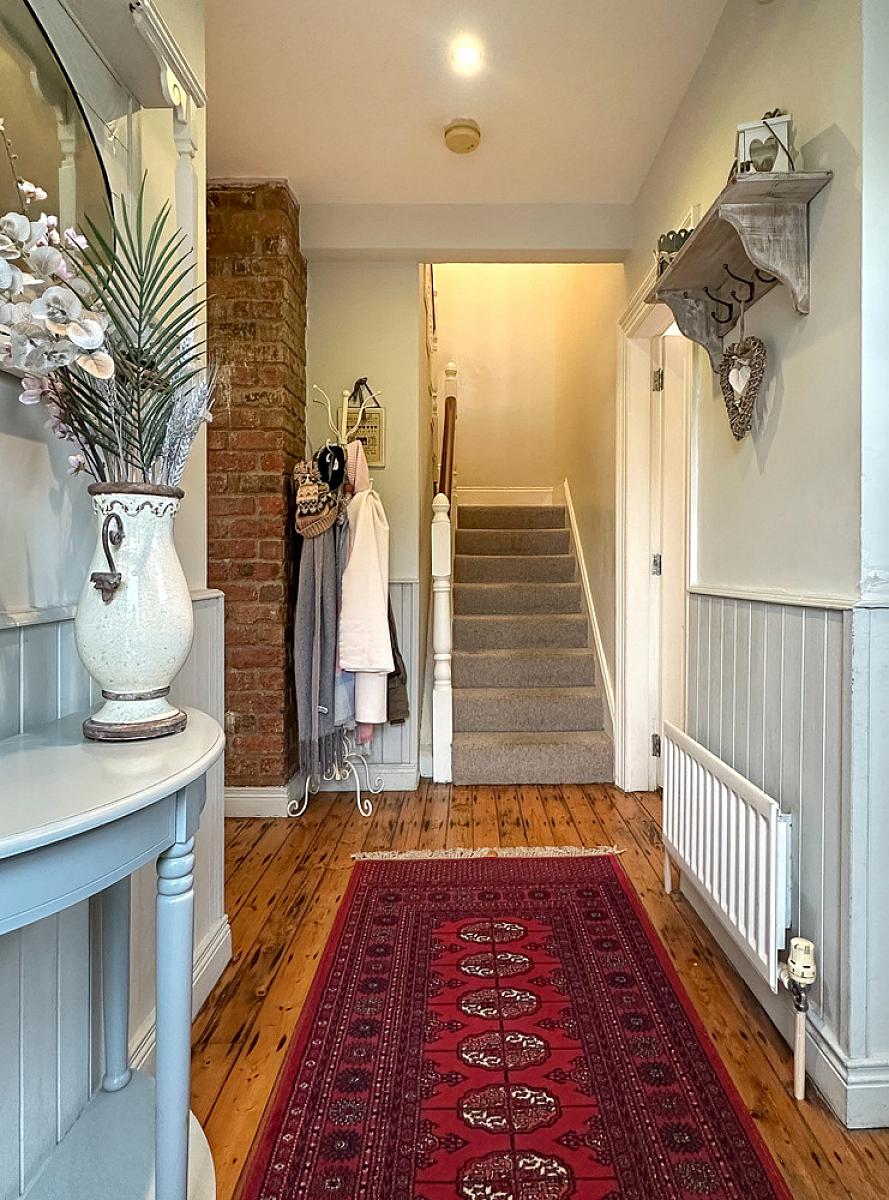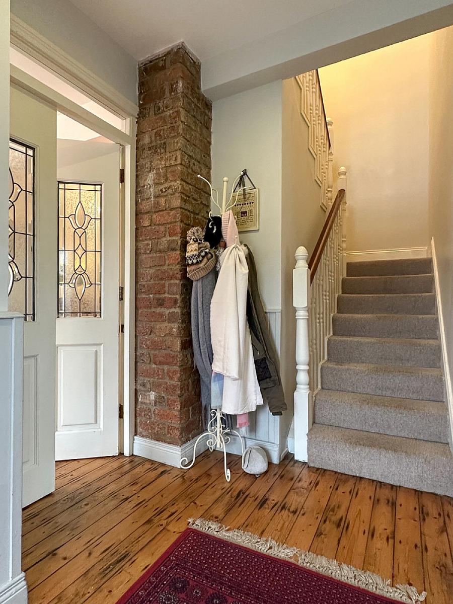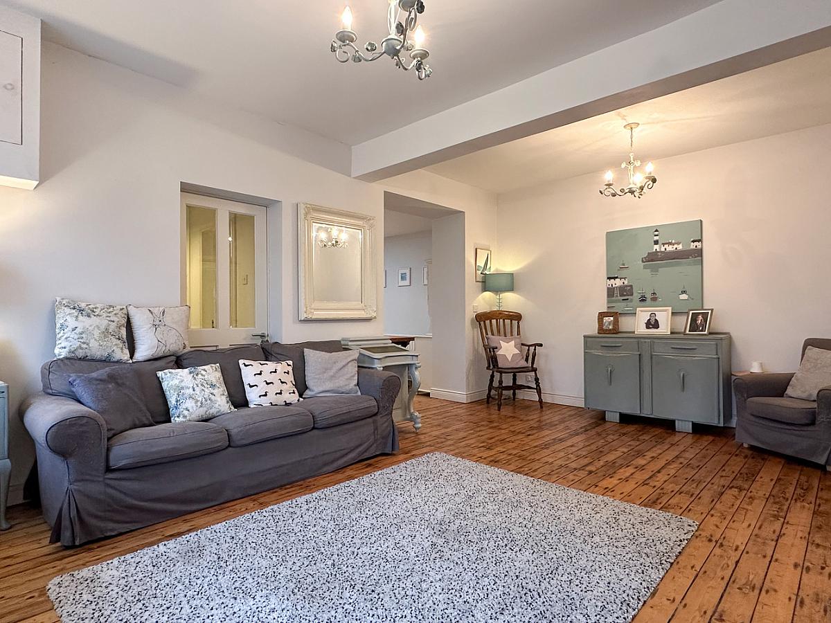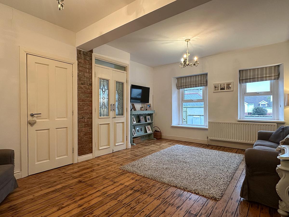 with French leaded glass panel doors from hall, wooden flooring, under stairs storage, glass panel door to rear hall. Open to: