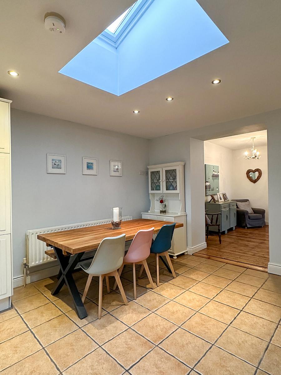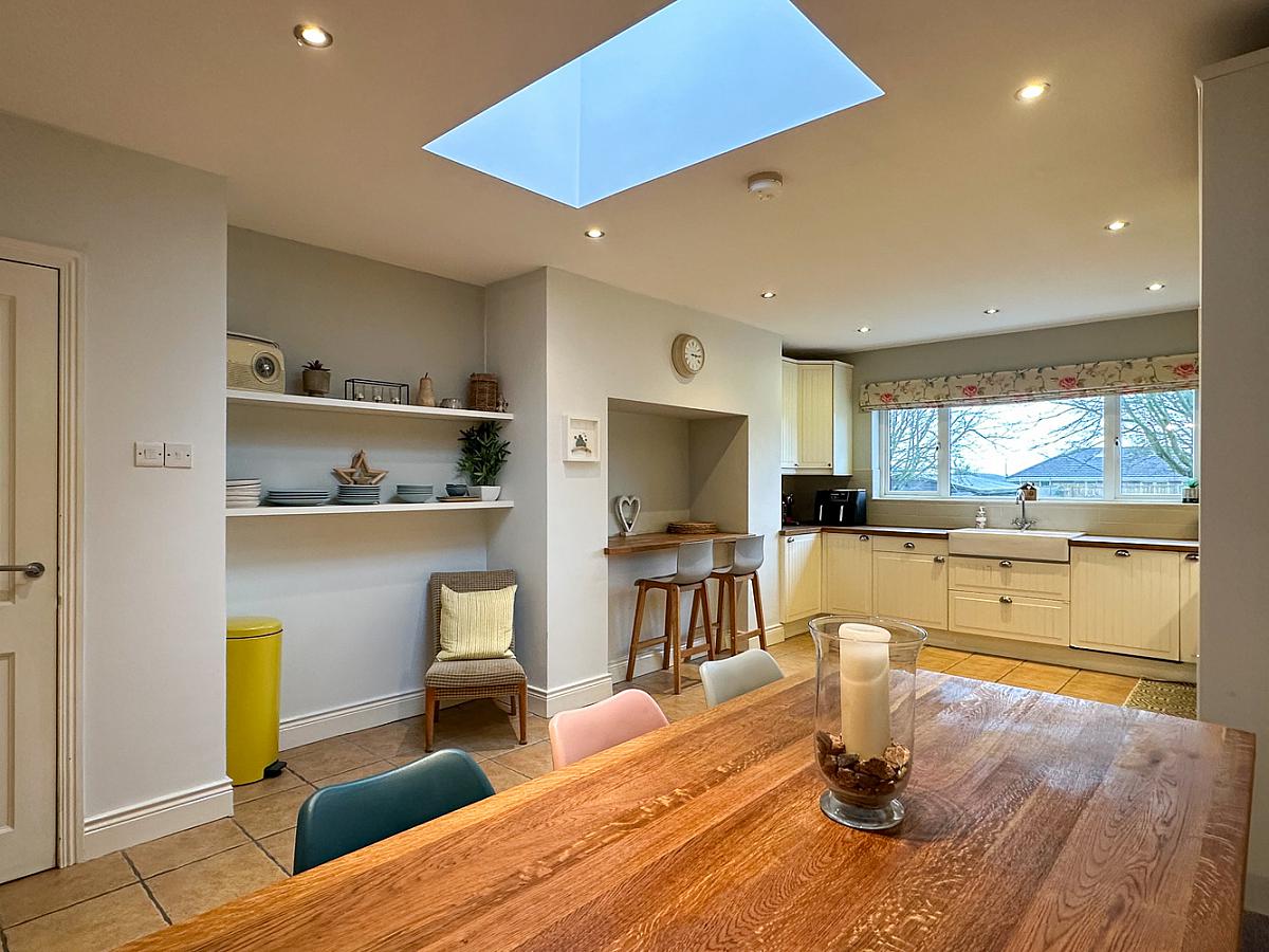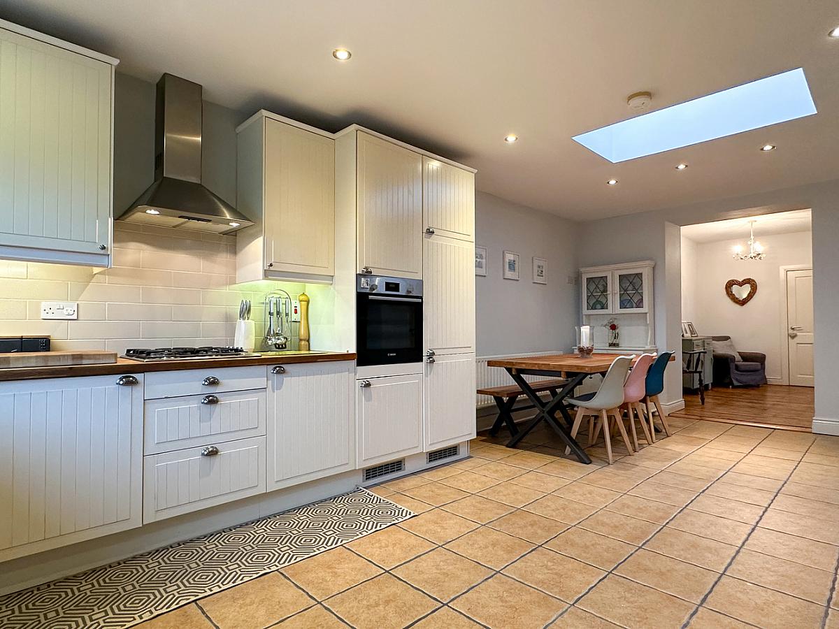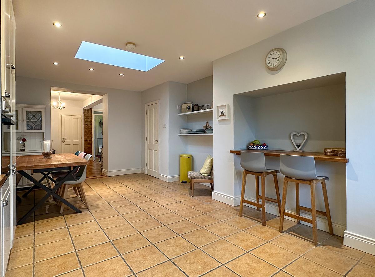 with eye and low level units, tiled between units, double Jawbox ceramic sink, stainless steel extractor fan, 4 ring gas hob, Bosch oven, integrated dishwasher, integrated fridge / freezer, tiled floor, recess lighting, concealed lighting, breakfast bar, recess shelving, Keylite roof window. Views over the rear garden.