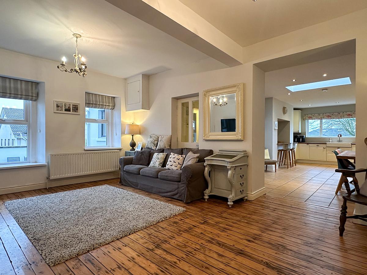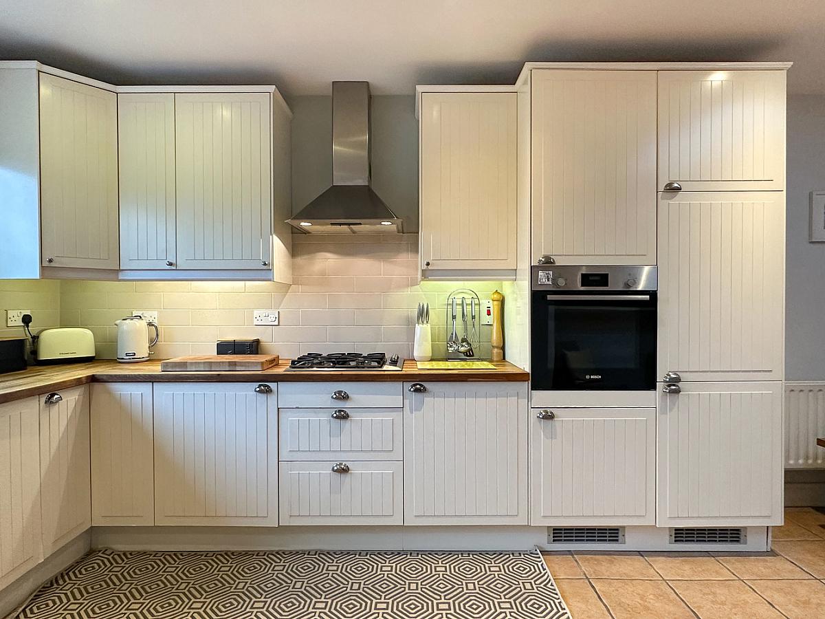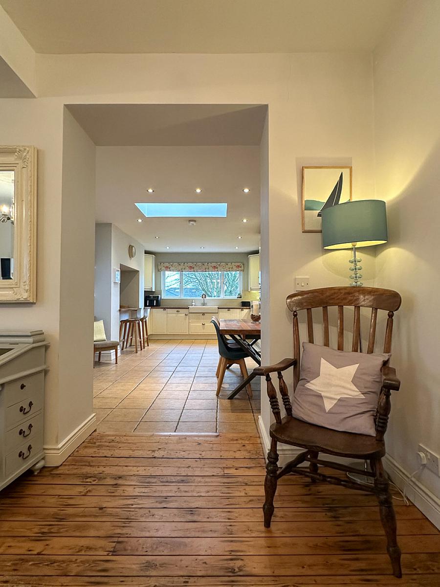 with eye and low level units, tiled between units, double Jawbox ceramic sink, stainless steel extractor fan, 4 ring gas hob, Bosch oven, integrated dishwasher, integrated fridge / freezer, tiled floor, recess lighting, concealed lighting, breakfast bar, recess shelving, Keylite roof window. Views over the rear garden.
