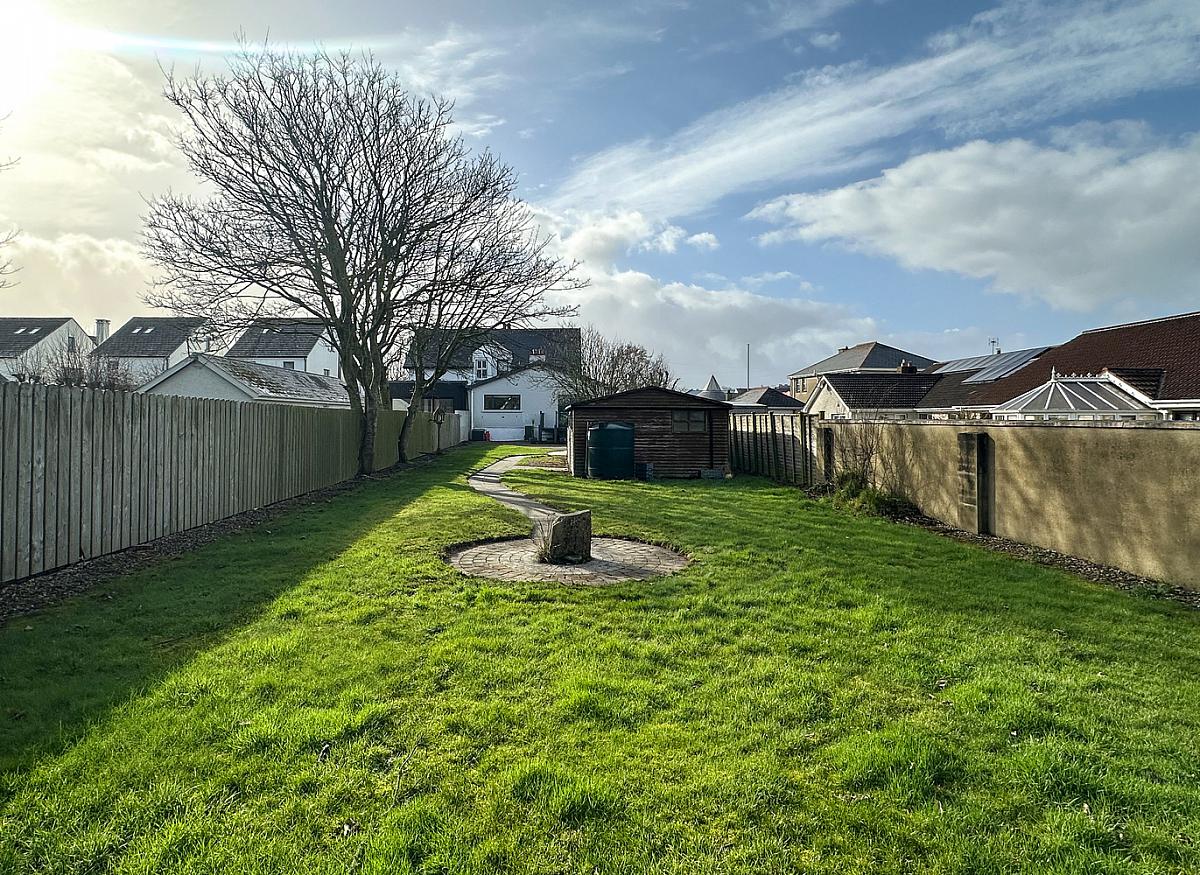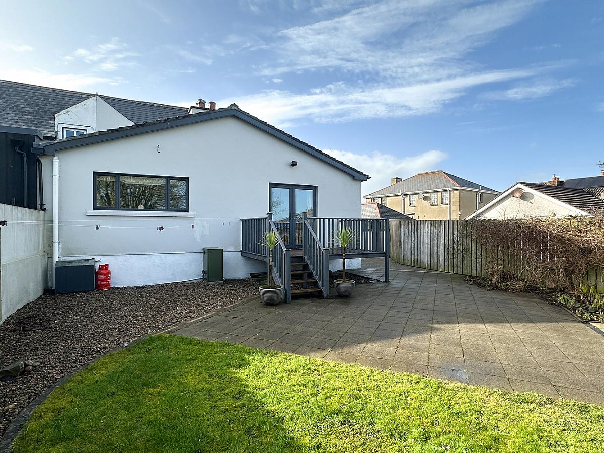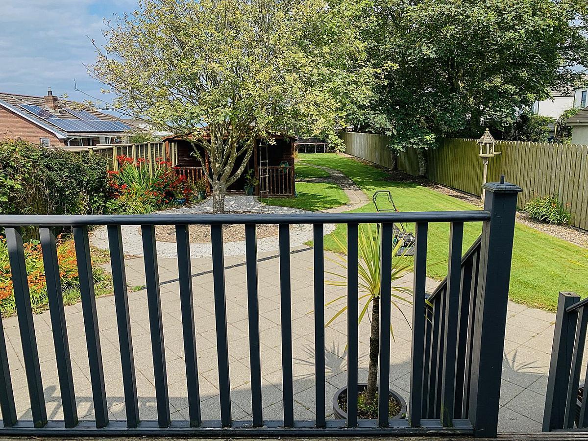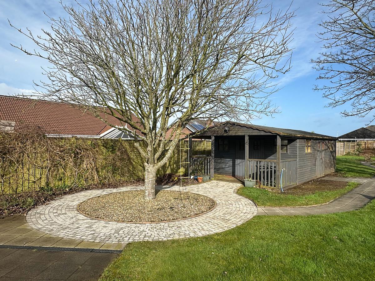 3 steps leading up to the front door. Garden laid in lawn to the front enclosed by wall and fencing with hedging. Vehicular gates. Extensive screened parking area and driveway to the front. Paviour area to the side with fence to the front and pedestrian gate. 4 steps leading up to the side door. Outside lights to the front, side and rear. Paved patio area to the rear. 5 steps leading up to the raised decking area outside Bedroom 1. Boiler. Water tap to the rear. Extensive garden laid in lawn to the rear enclosed by fencing and wall with paved paths and screened beds, some with shrubs. PVC oil tank. Wooden garden room with veranda.