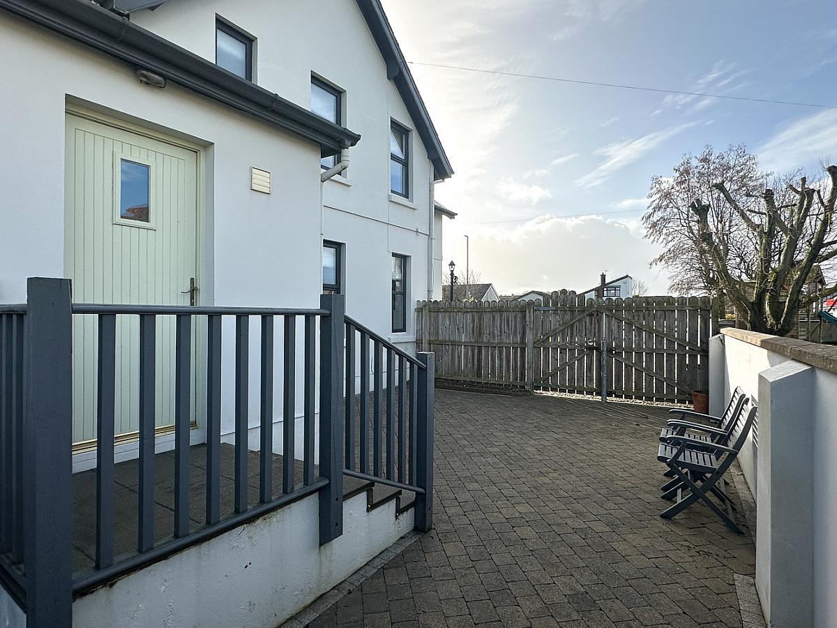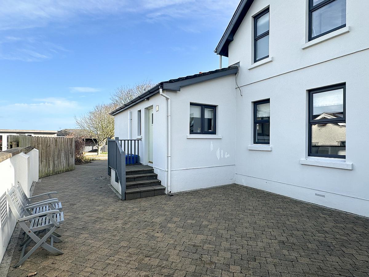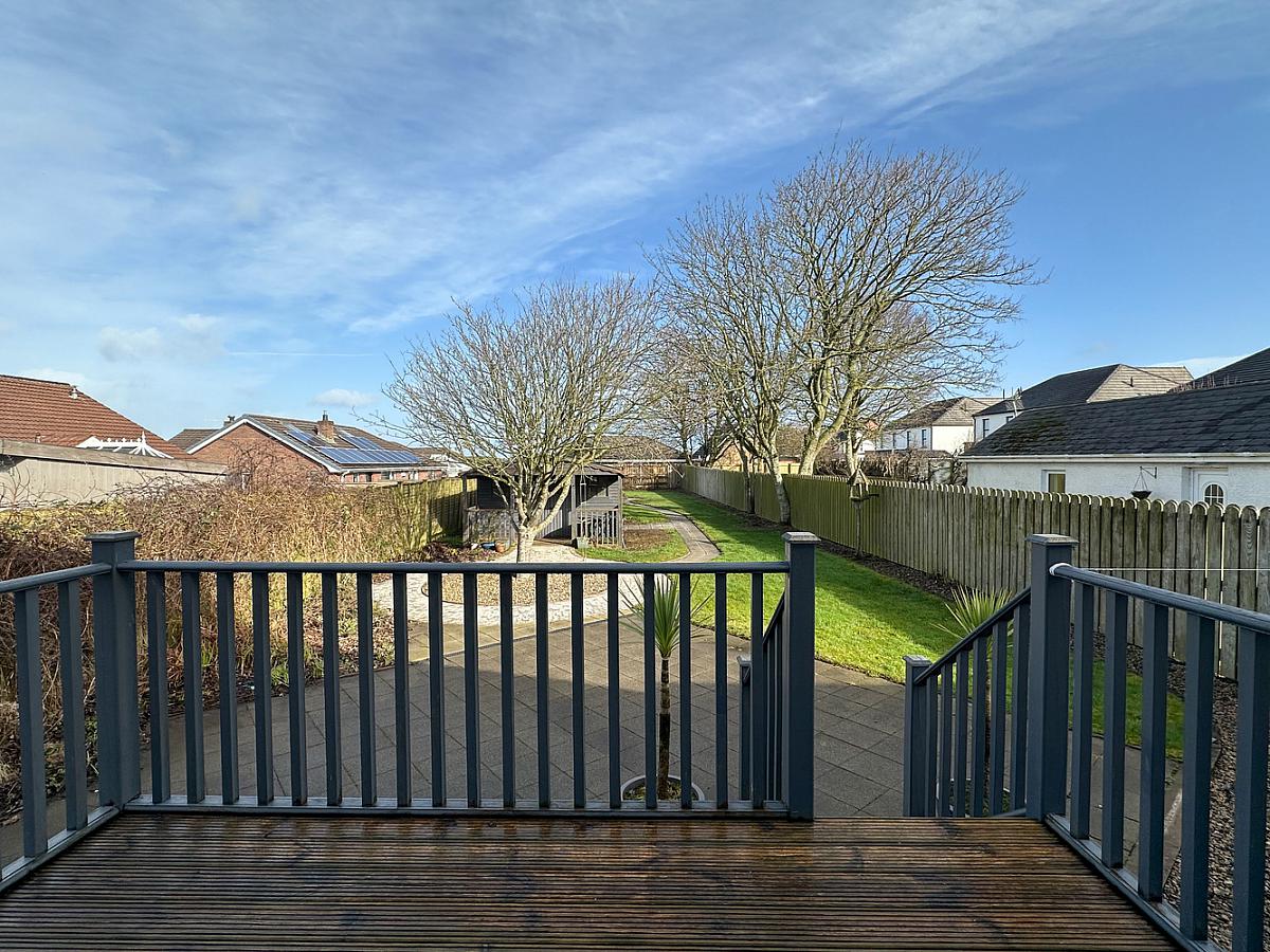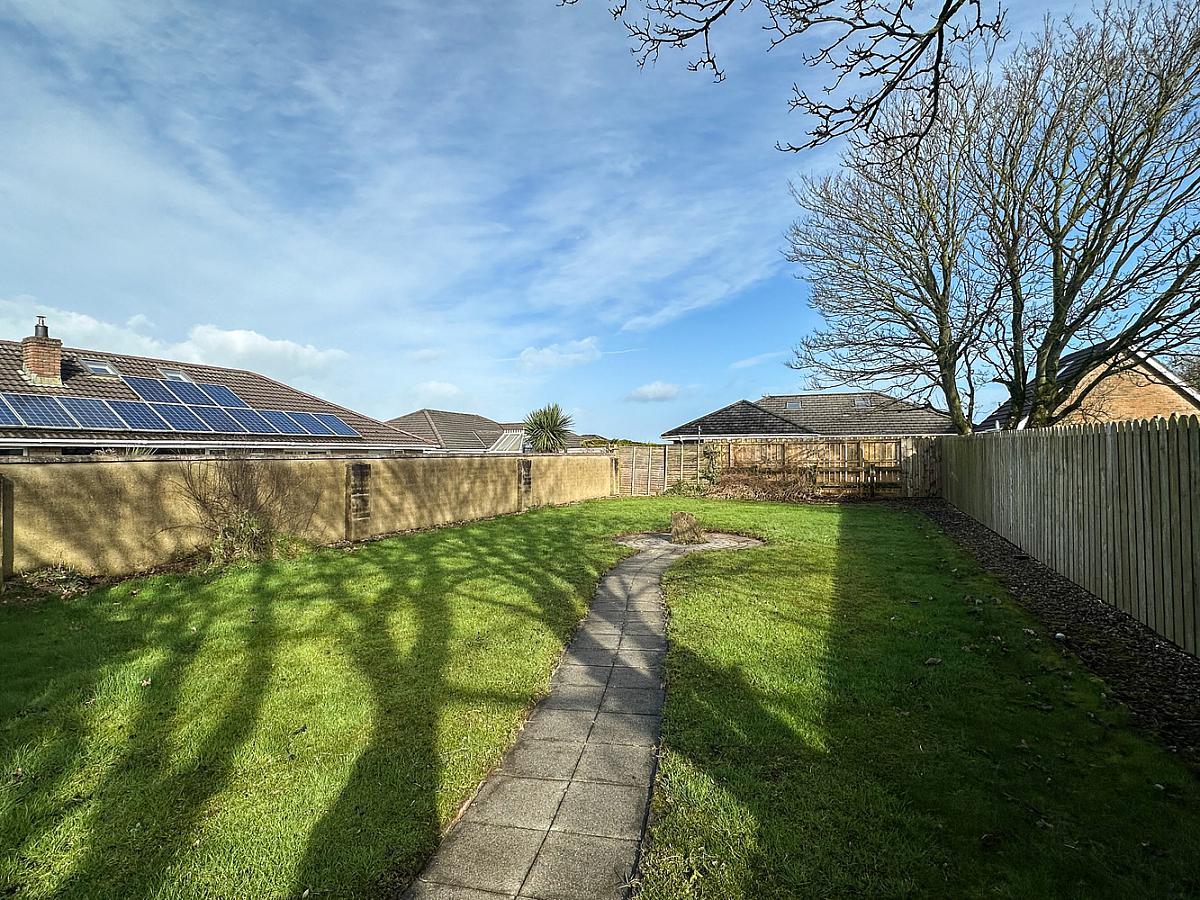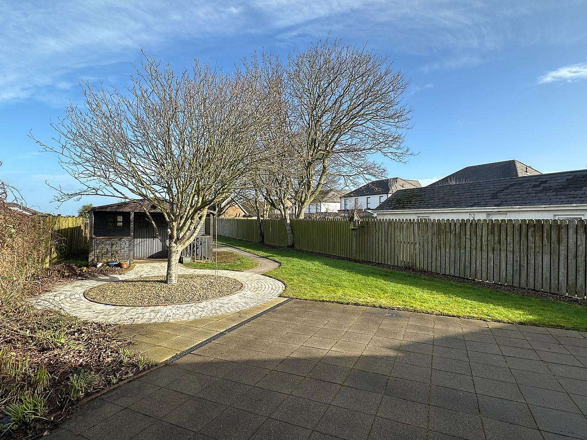 3 steps leading up to the front door. Garden laid in lawn to the front enclosed by wall and fencing with hedging. Vehicular gates. Extensive screened parking area and driveway to the front. Paviour area to the side with fence to the front and pedestrian gate. 4 steps leading up to the side door. Outside lights to the front, side and rear. Paved patio area to the rear. 5 steps leading up to the raised decking area outside Bedroom 1. Boiler. Water tap to the rear. Extensive garden laid in lawn to the rear enclosed by fencing and wall with paved paths and screened beds, some with shrubs. PVC oil tank. Wooden garden room with veranda.