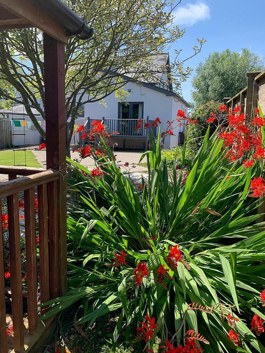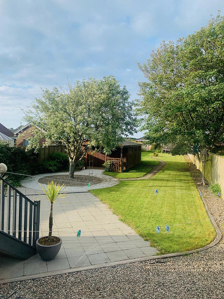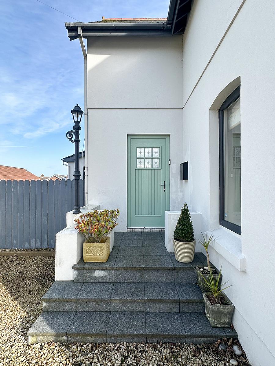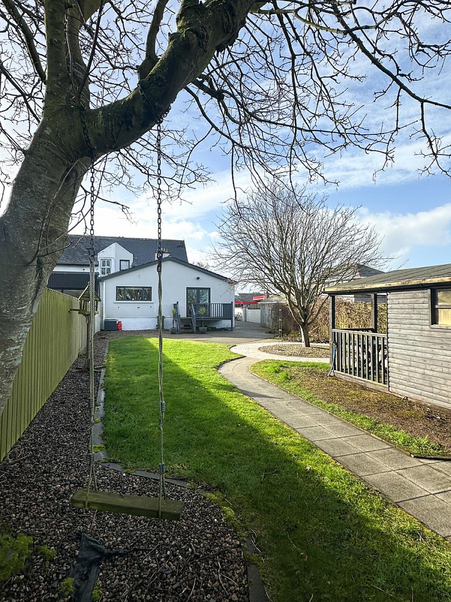 3 steps leading up to the front door. Garden laid in lawn to the front enclosed by wall and fencing with hedging. Vehicular gates. Extensive screened parking area and driveway to the front. Paviour area to the side with fence to the front and pedestrian gate. 4 steps leading up to the side door. Outside lights to the front, side and rear. Paved patio area to the rear. 5 steps leading up to the raised decking area outside Bedroom 1. Boiler. Water tap to the rear. Extensive garden laid in lawn to the rear enclosed by fencing and wall with paved paths and screened beds, some with shrubs. PVC oil tank. Wooden garden room with veranda.