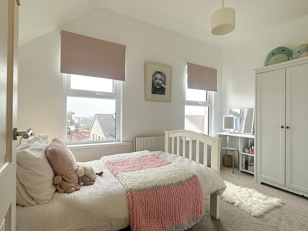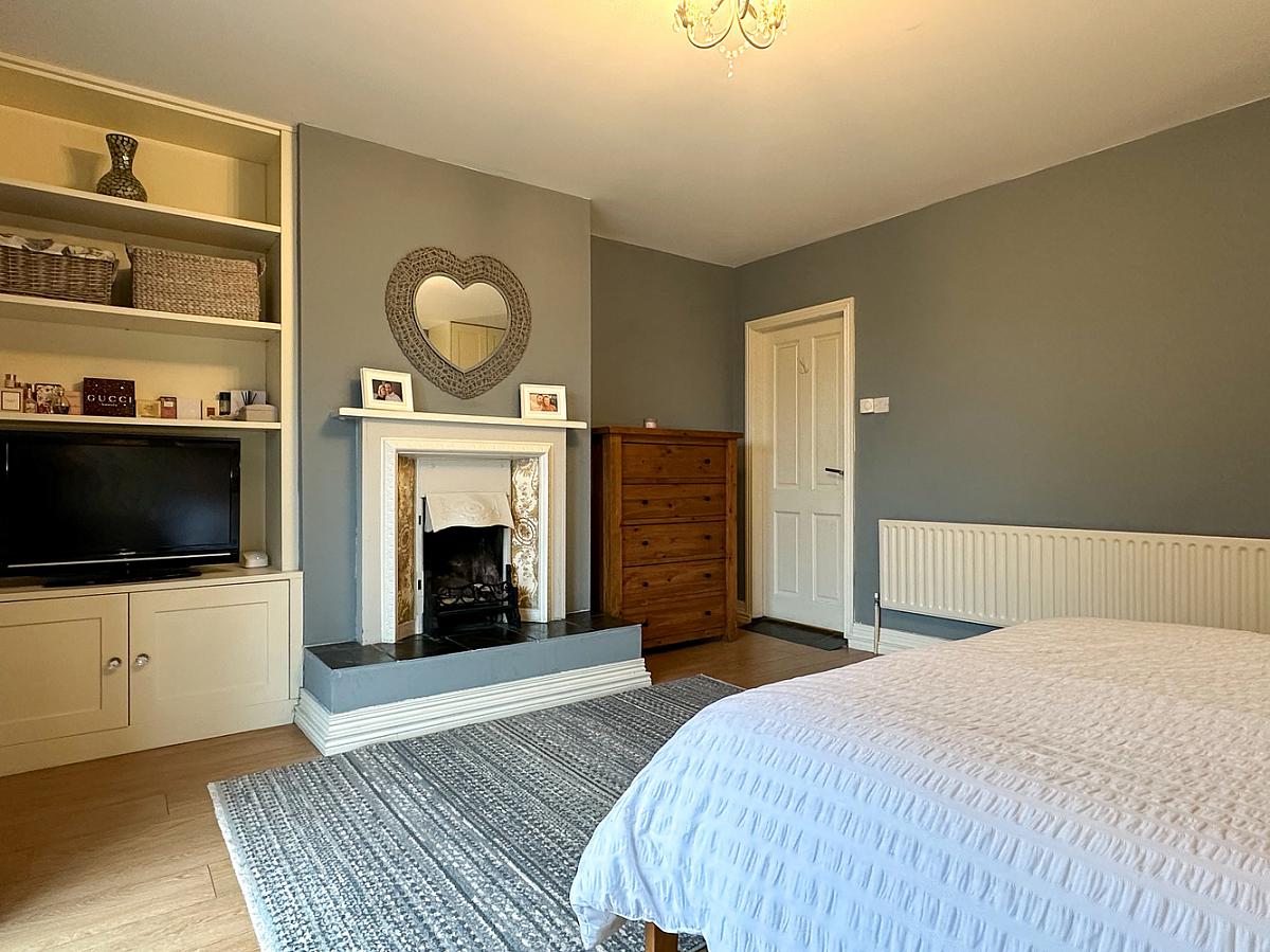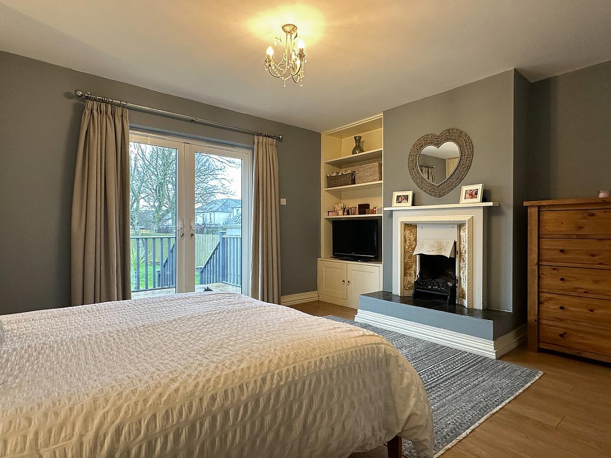 Off Rear Hall. With wooden effect flooring, raised wooden surround fireplace with cast iron and tiled inset, tiled hearth, recess shelving, 2 built-in double wardrobes with set of drawers, 2 built-in bedside lockers, uPVC glass panel French doors leading to raised decking area with views overlooking the rear garden.
