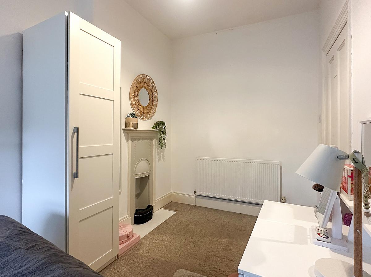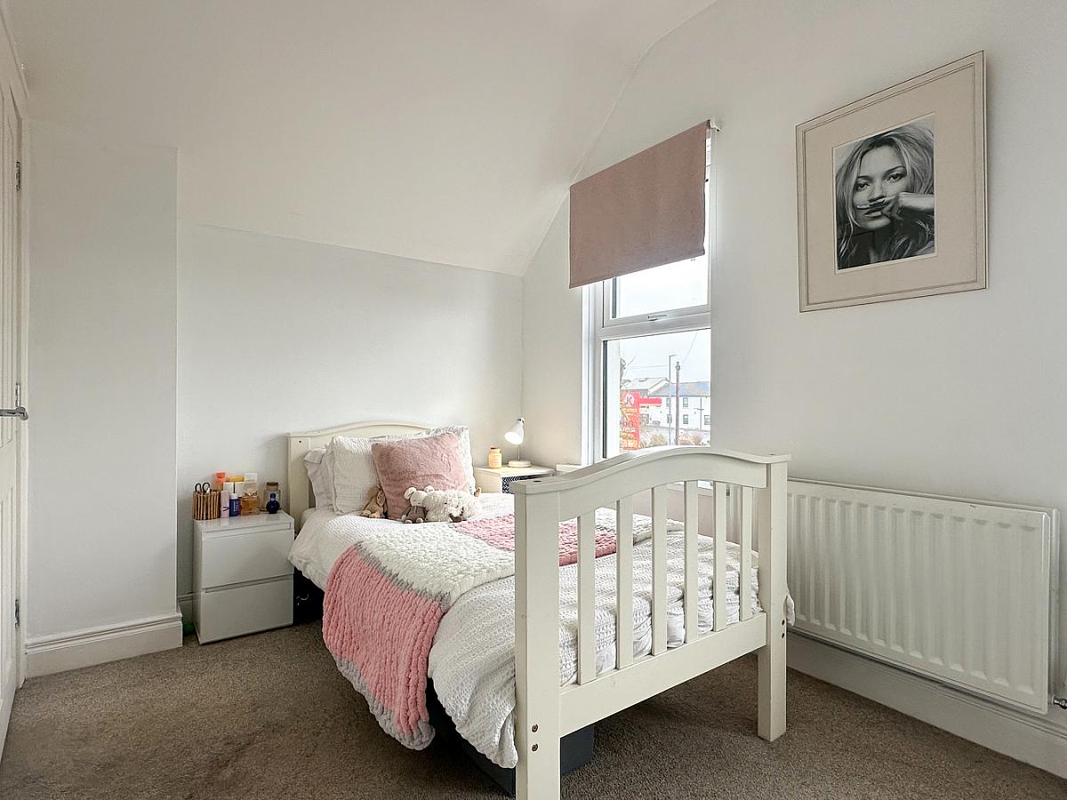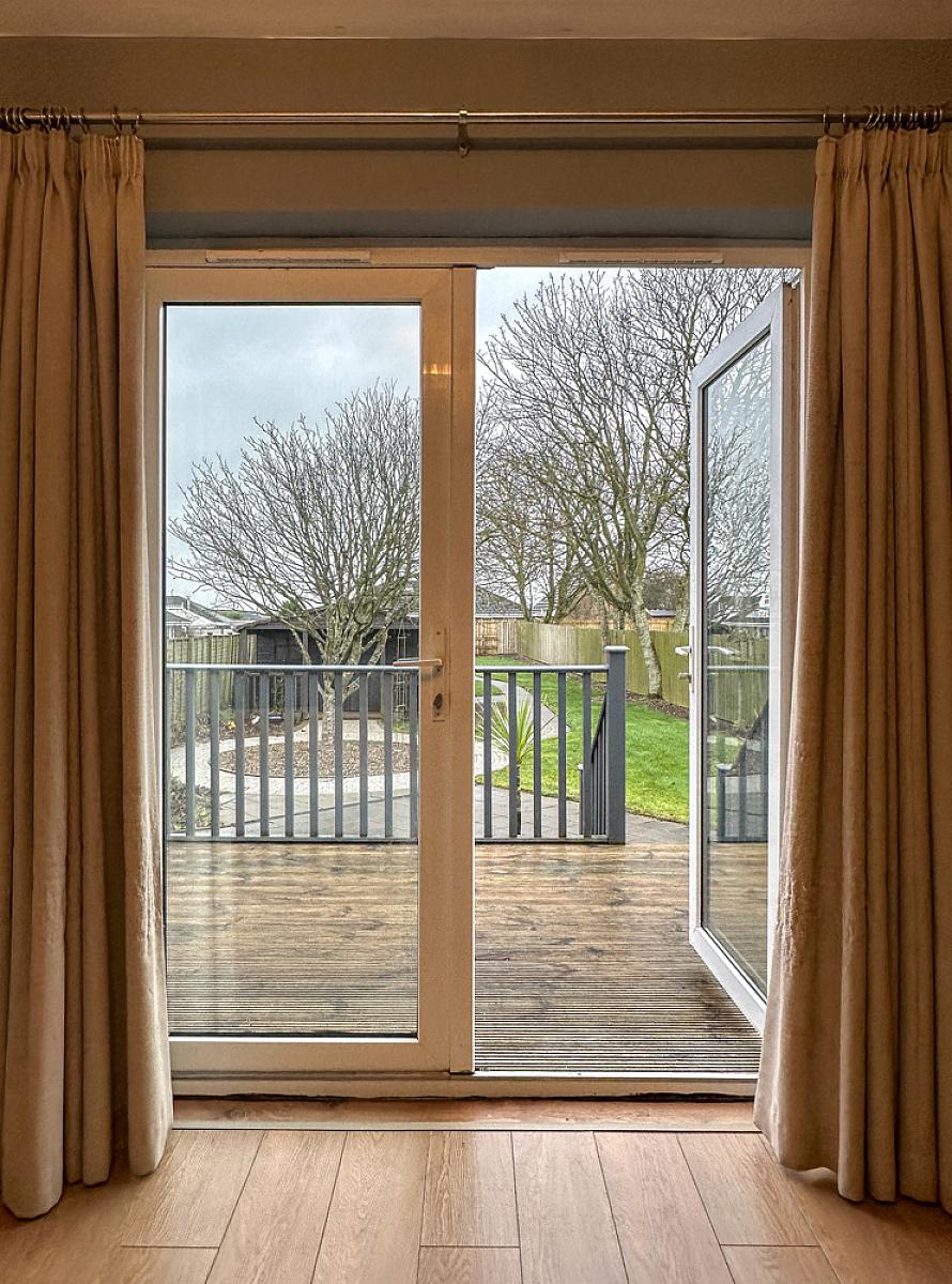 Off Rear Hall. With wooden effect flooring, raised wooden surround fireplace with cast iron and tiled inset, tiled hearth, recess shelving, 2 built-in double wardrobes with set of drawers, 2 built-in bedside lockers, uPVC glass panel French doors leading to raised decking area with views overlooking the rear garden.