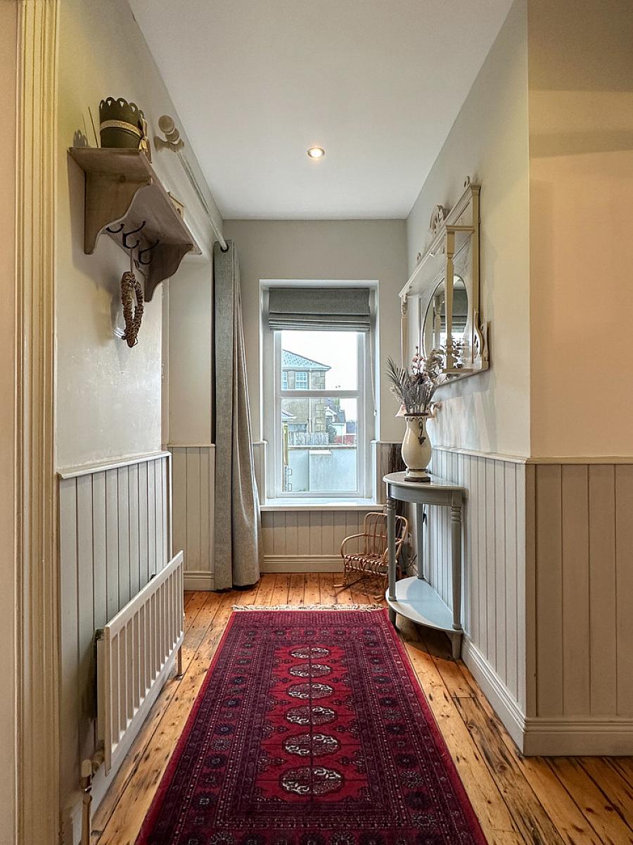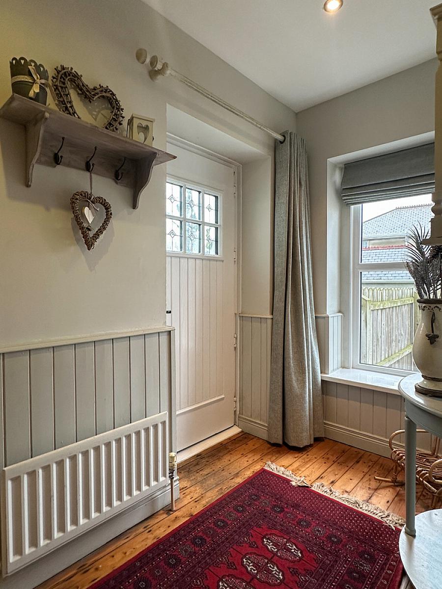 with half panelled walls, recess lighting, wooden flooring, composite glass panel front door.