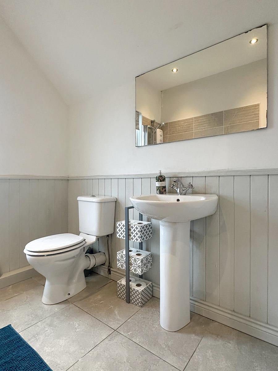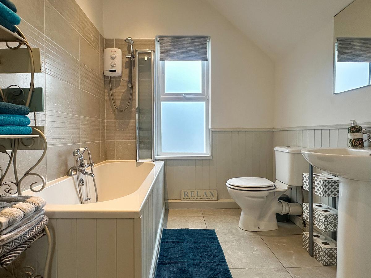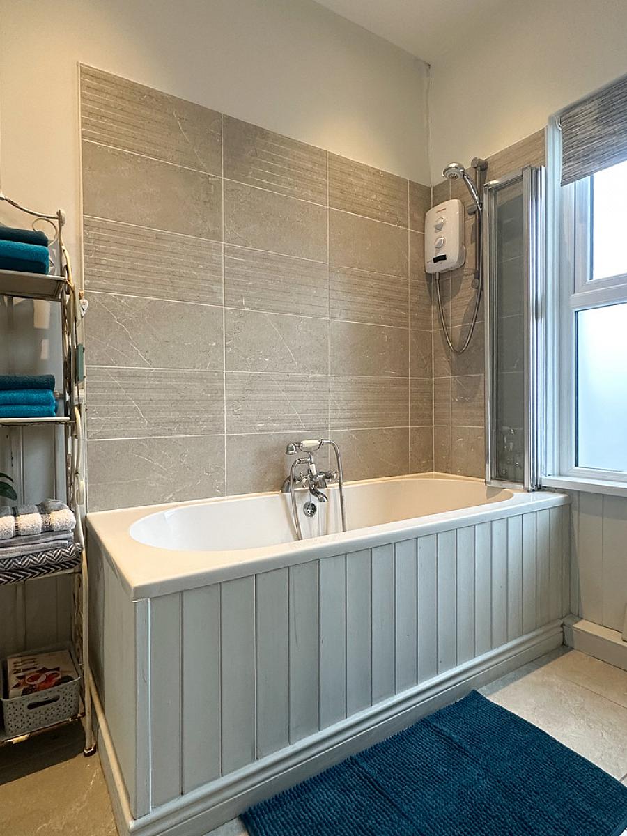 Comprising panel bath with telephone hand shower and Redring electric shower fitting over bath, shower screen over bath, tiled around bath, wash hand basin, w.c., half panelled walls, tiled floor, recess lighting, hot press.