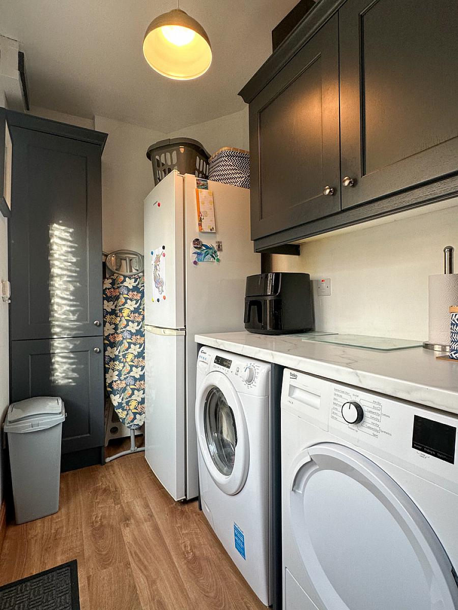 with eye and low level units including housing for gas boiler, plumbed for washing machine, space for tumble dryer, space for fridge / freezer, uPVC door to side garden, wooden effect flooring.