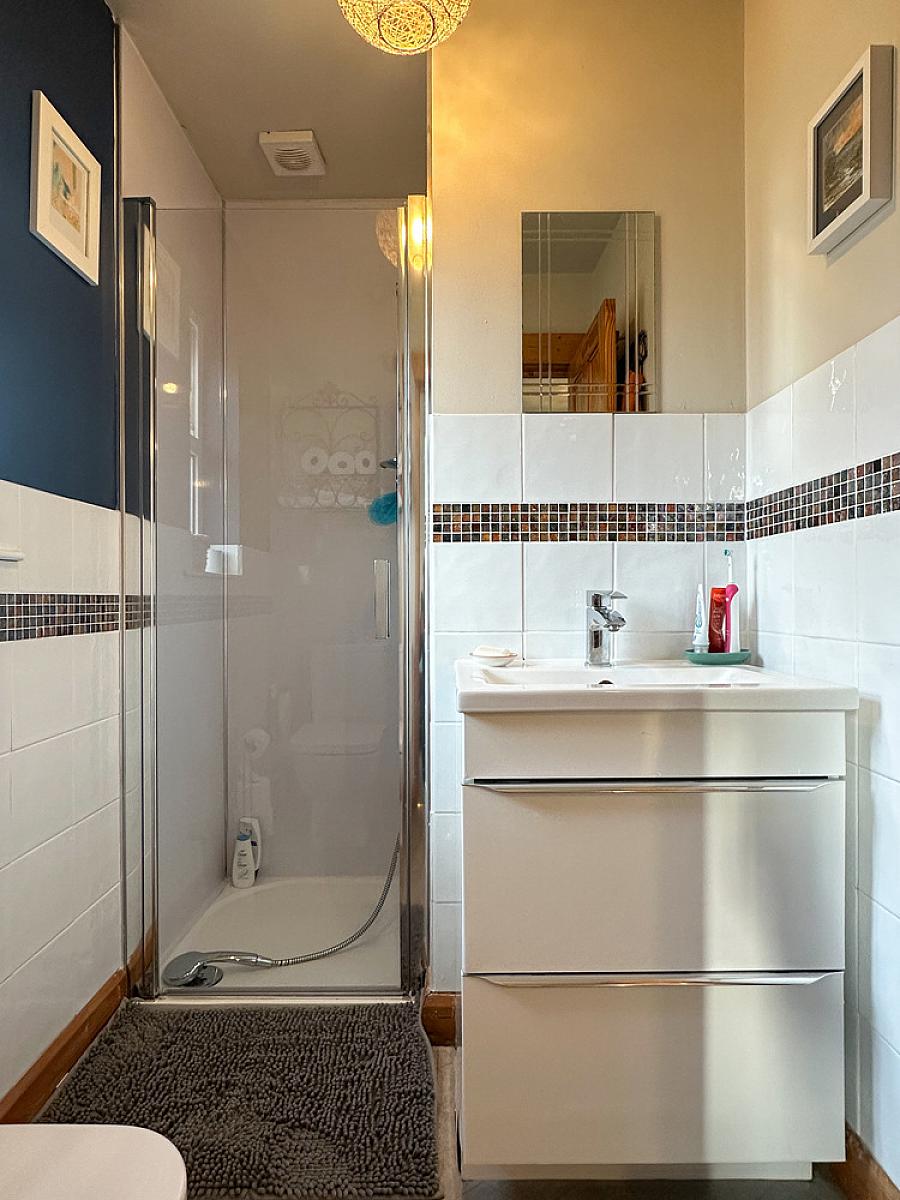 Comprising wash hand basin set in vanity unit, w.c., PVC paneled shower cubicle with Triton mains shower fitting, extractor fan.