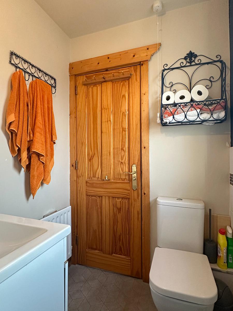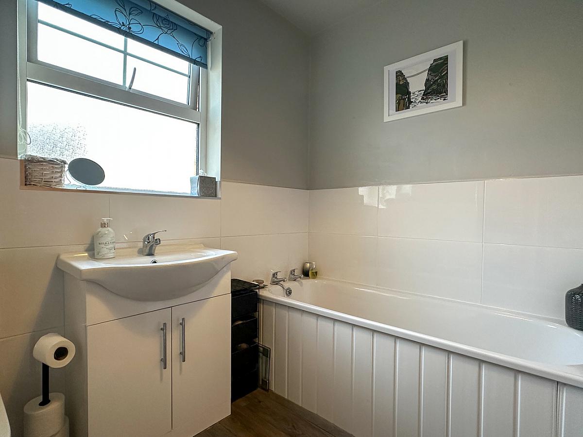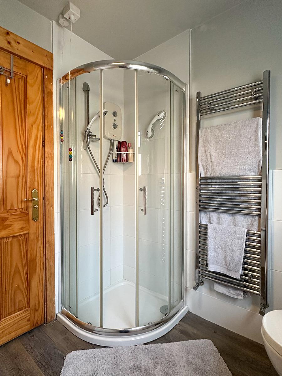Comprising wash hand basin set in vanity unit, w.c., panel bath, corner tiled shower cubicle with Redring electric shower fitting, half tiled walls, extractor fan, heated towel rail, wooden effect flooring.