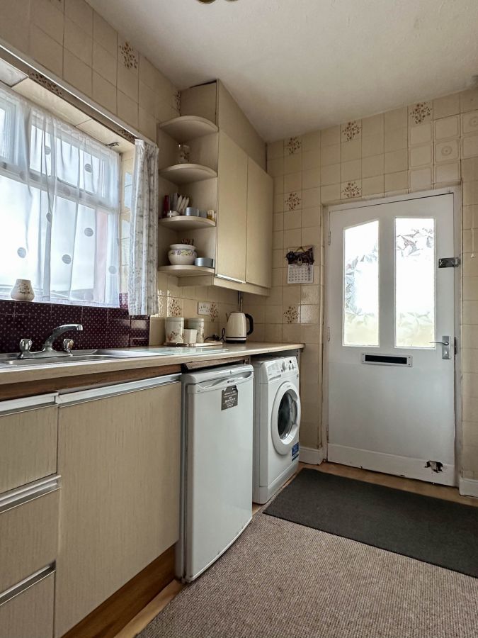 With eye and low level units, stainless steel sink unit with drainer, space for cooker, extractor fan, space for undercounter fridge, plumbed for washing machine, fully tiled walls, wood rear door with glass panels.