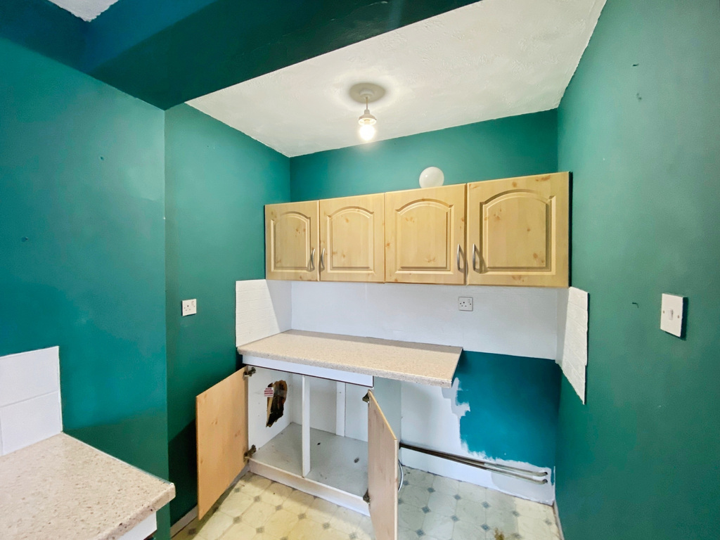 (Widest Point) With range of eye and low level units, partial tiling around worktop, stainless steel sink unit with mixer tap, space for cooker, dishwasher or washing machine. Laminate wood flooring, half panelled walls and French doors leading to rear.