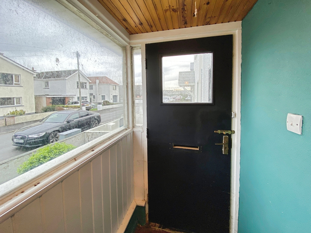 Fully enclosed concrete front with screened areas and tiled steps. Garden to rear.