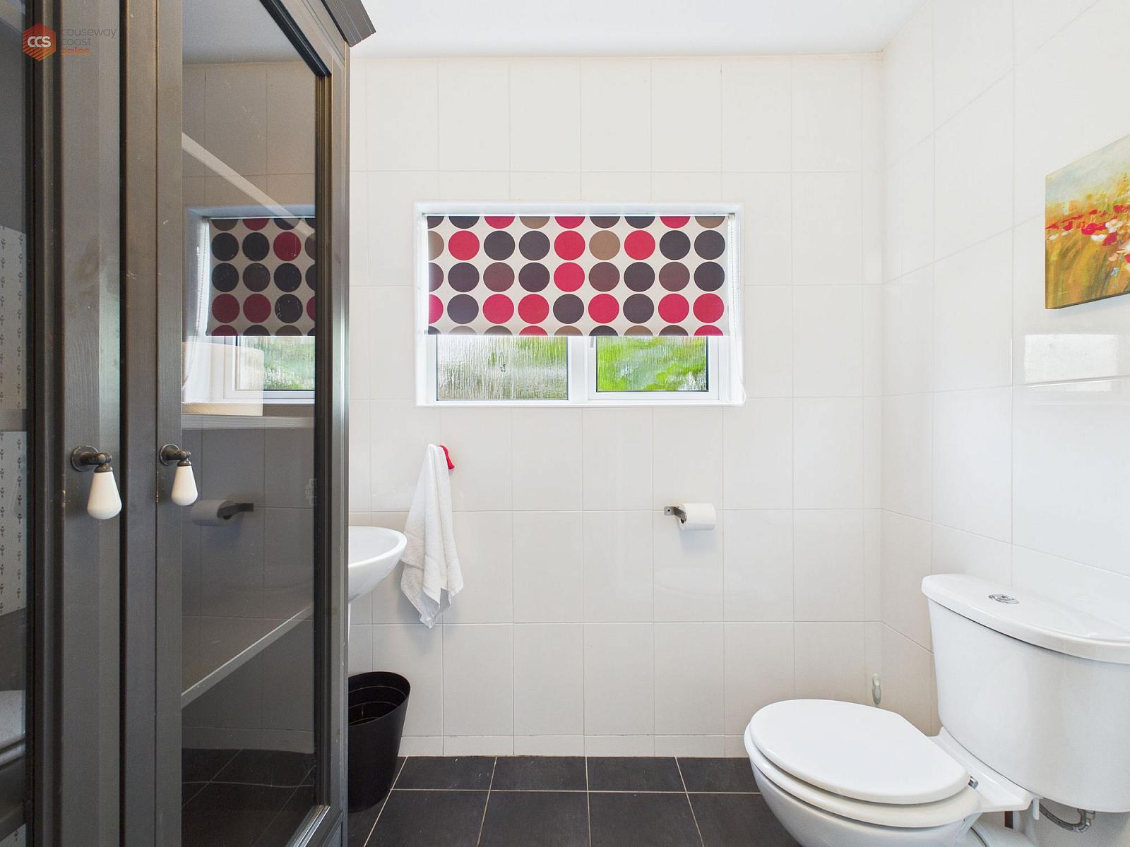 Shower room with corner shower cubicle. Low flushing toilet. Pedestal wash hand basin. Frosted glass uPVC window. Tiled flooring and walls.