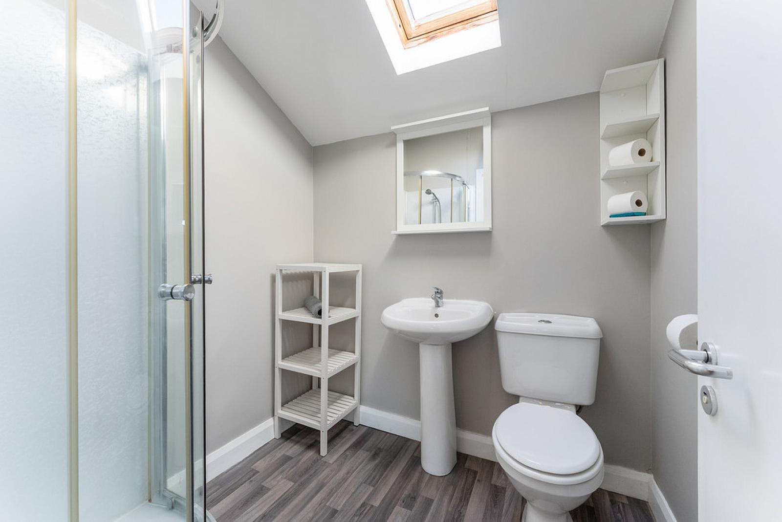 SHOWER ROOM Corner shower cubicle with thermostatic shower unit. Low flush wc. Pedestal wash hand basin with mixer tap. Extractor fan. Velux window.