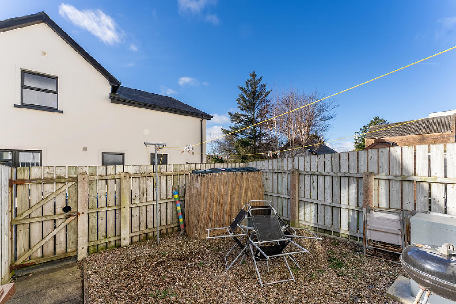 To the back there is a South facing private enclosed rear paved garden, laid in loose stones. Bordered by fencing.