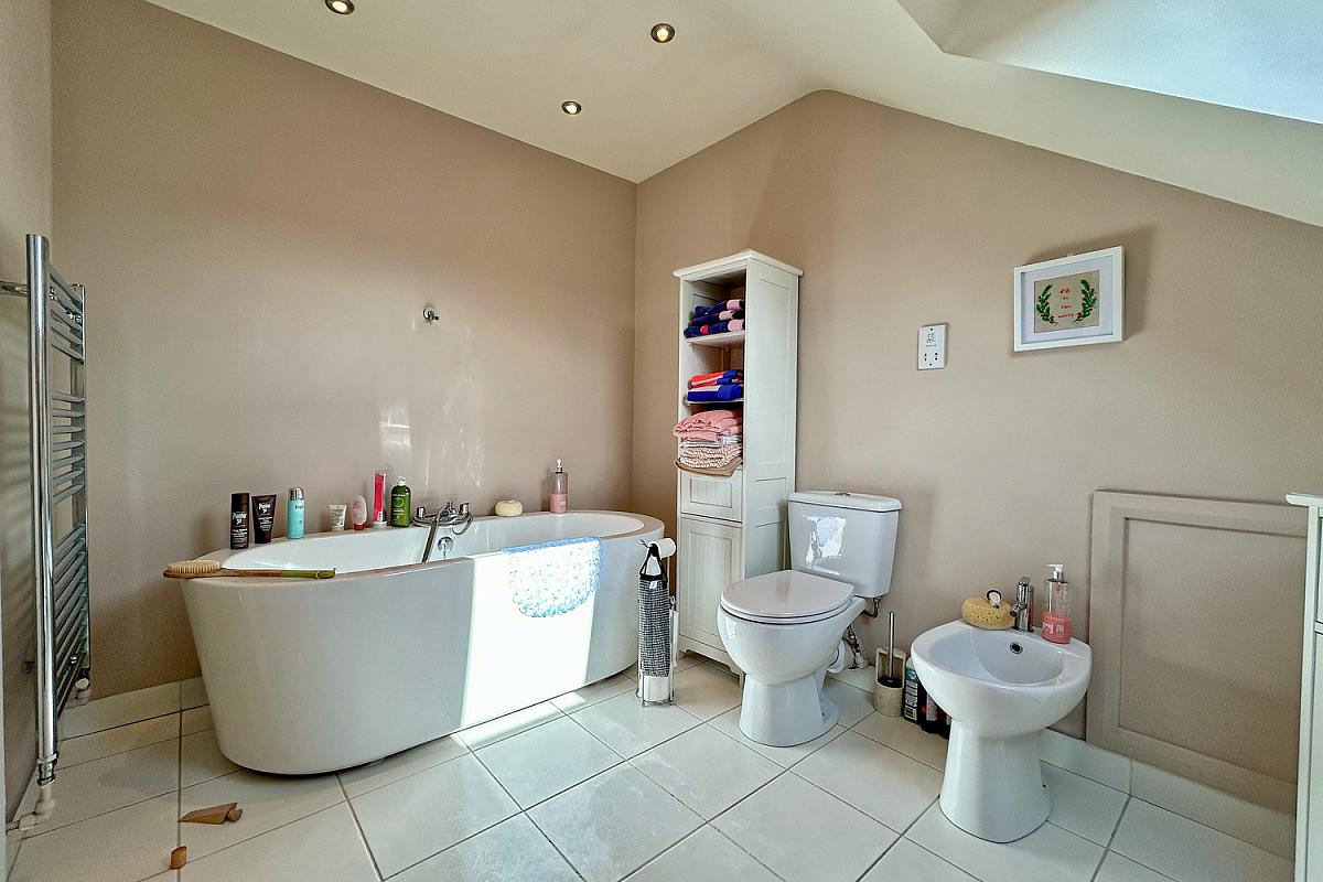 Free standing bath tub with shower wan attachment; toilet; wall mounted wash hand basin; bidet; chrome towel radiator; tiled floor; recessed lighting.