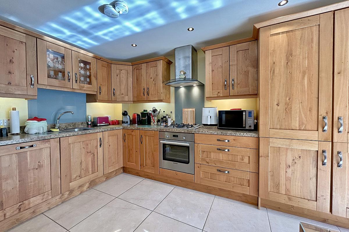 Range of solid Oak fitted units; laminate work surfaces; stainless steel sink & drainer; integrated fridge freezer & dishwasher; electric oven; gas hob with extractor unit over; patio doors to the rear; tiled floor.