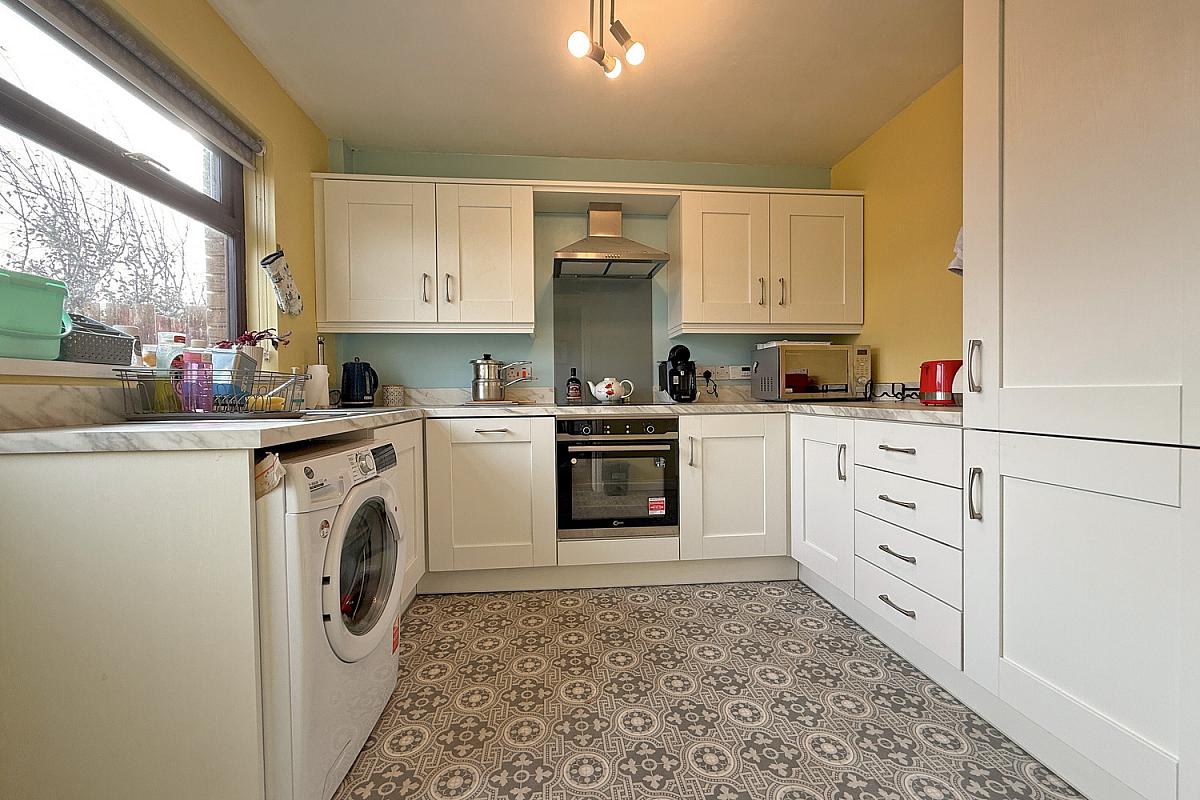 Range of fitted units; laminate work surfaces; stainless steel sink & drainer; integrated fridge freezer & dishwasher; electric oven; induction hob with extractor unit over; plumbed for washing machine; vinyl floor; door to the rear.
