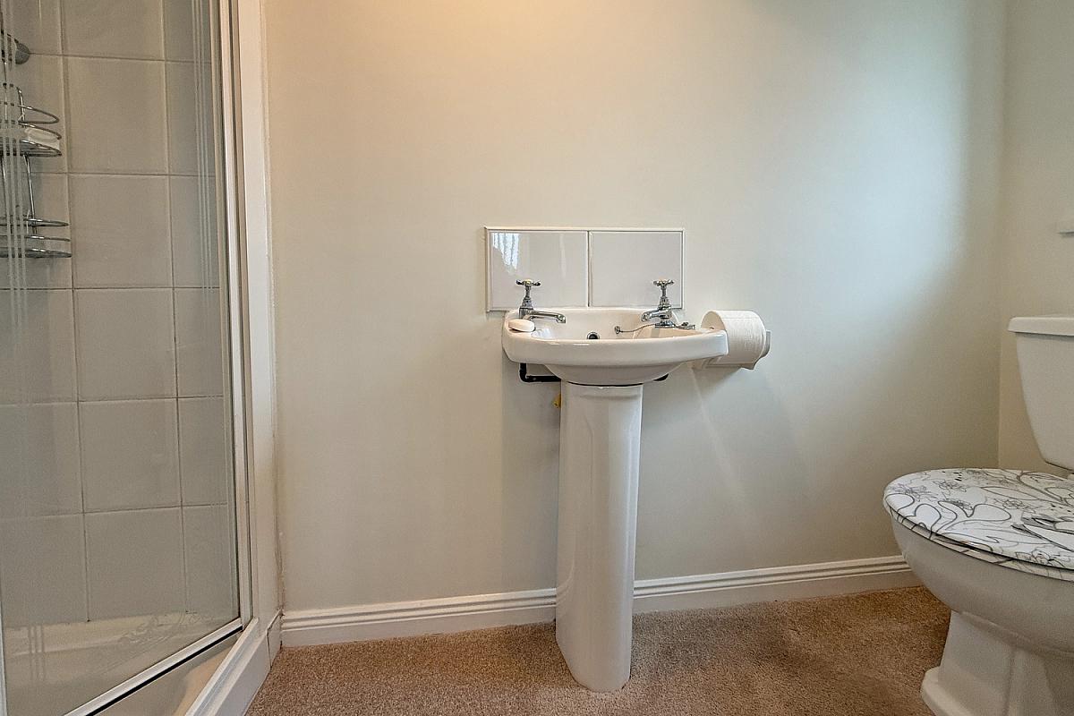 Tiled shower cubicle with electric shower; toilet; wash hand basin.