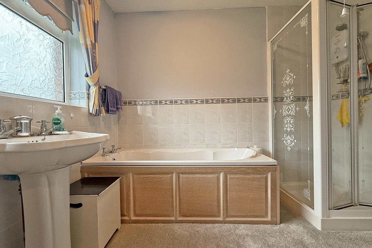 Panel bath; tiled shower cubicle with electric shower; toilet; wash hand basin; part tiled walls.