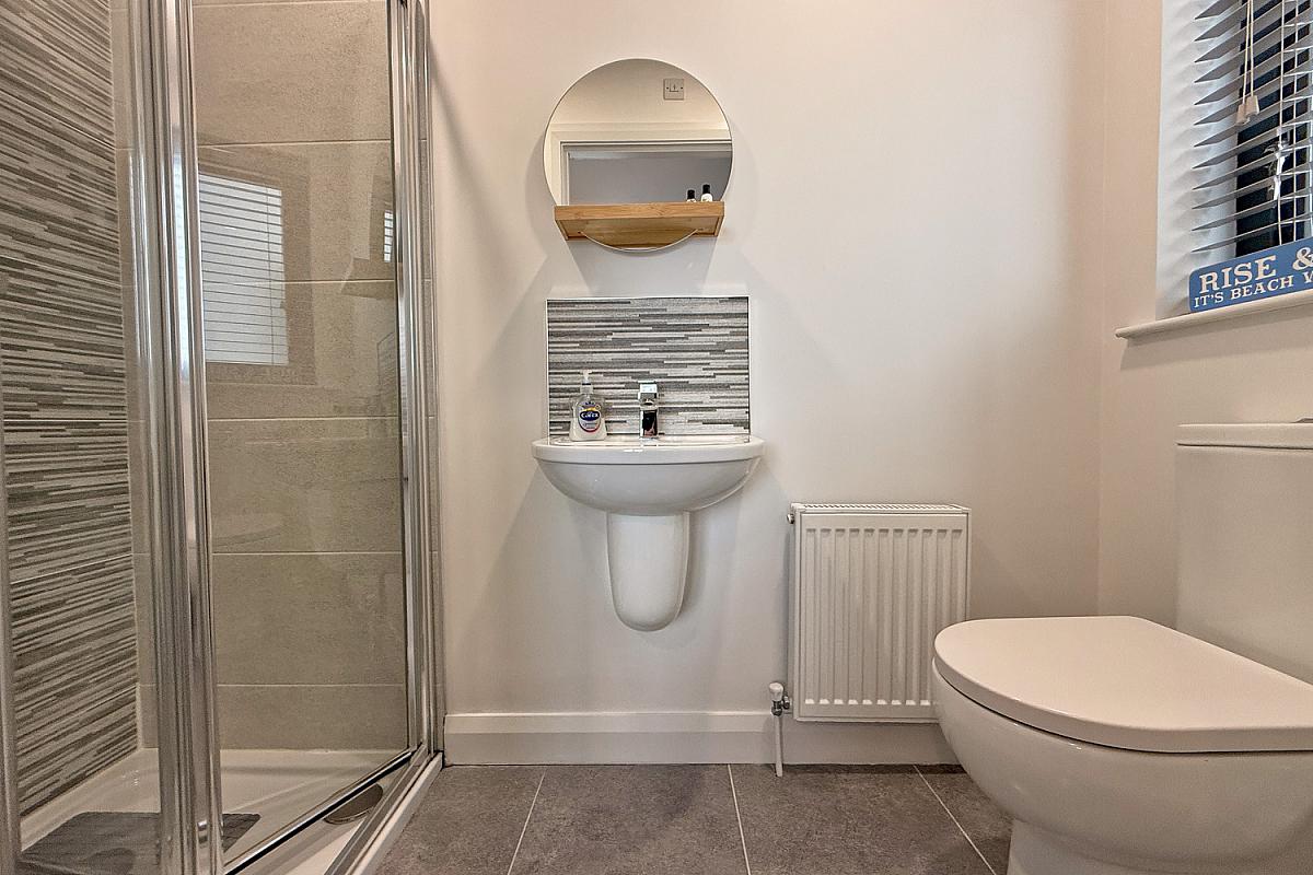 Tiled shower cubicle; toilet; wash hand basin; chrome towel radiator; tiled flooring.