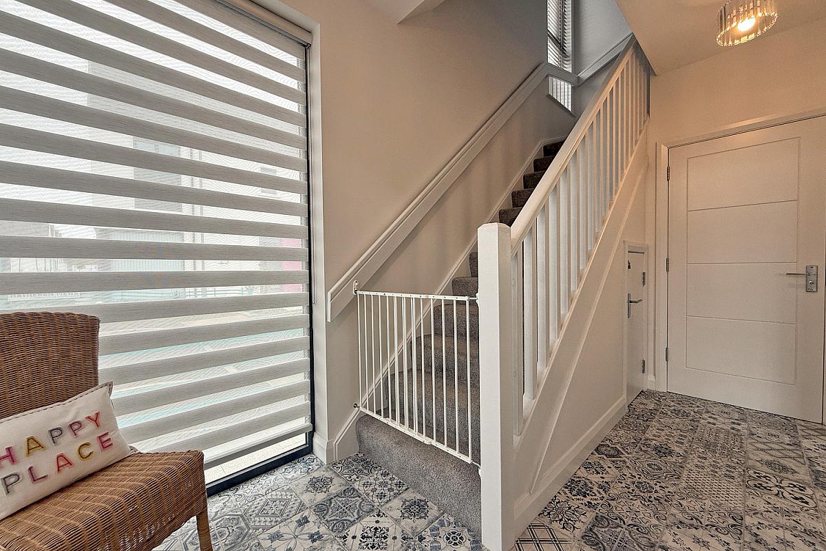 Mosaic-style tiled flooring; under-stair storage.