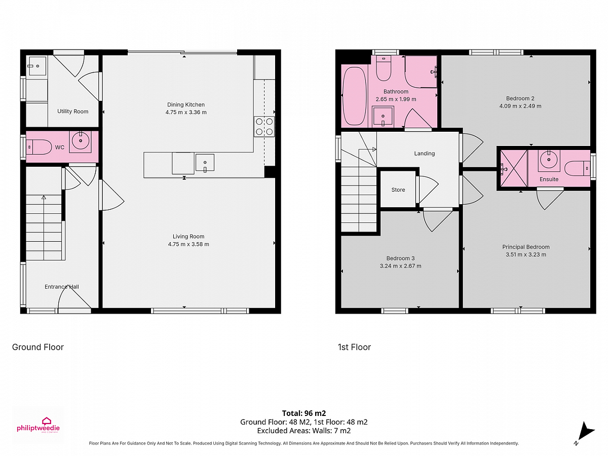 The ground floor features a spacious open-plan kitchen, living and dining area, along with a utility room and a downstairs WC. Upstairs comprises three well-proportioned bedrooms, including a principal bedroom with en suite, as well as the main bathroom.