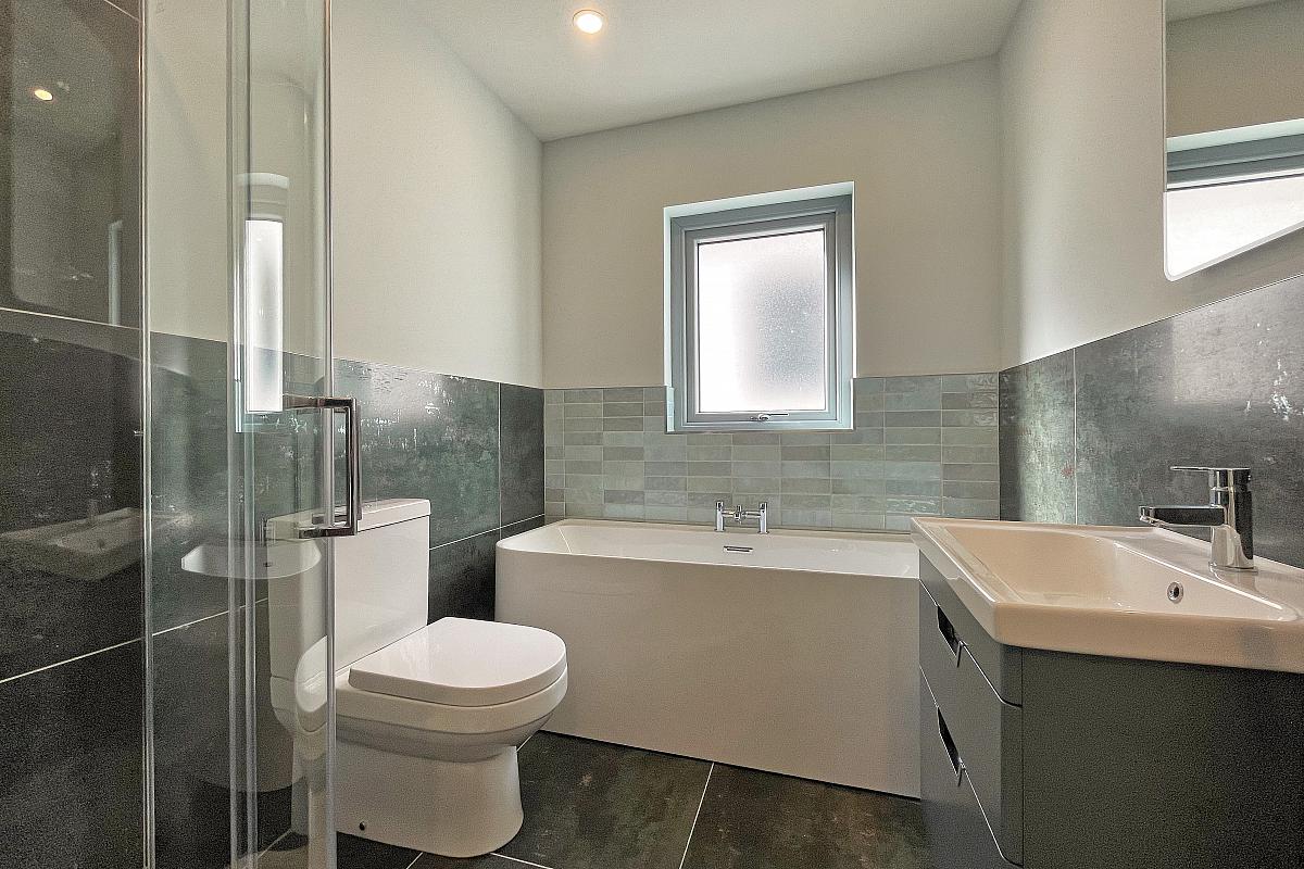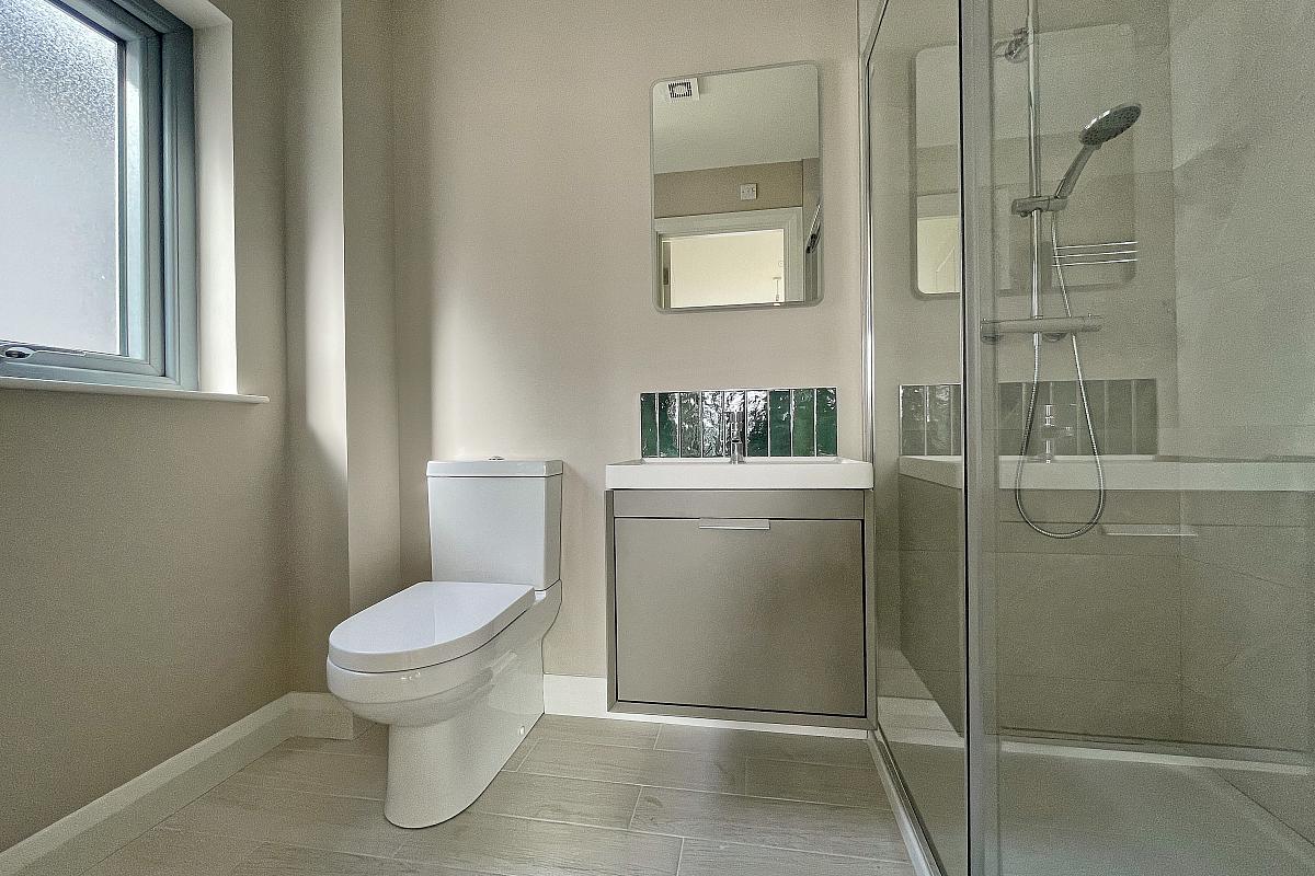 Free standing bath; large tiled shower cubicle; toilet; wall mounted vanity unit with wash hand basin; chrome towel radiator; back light mirror; tiled floor; spot lighting; extractor fan.