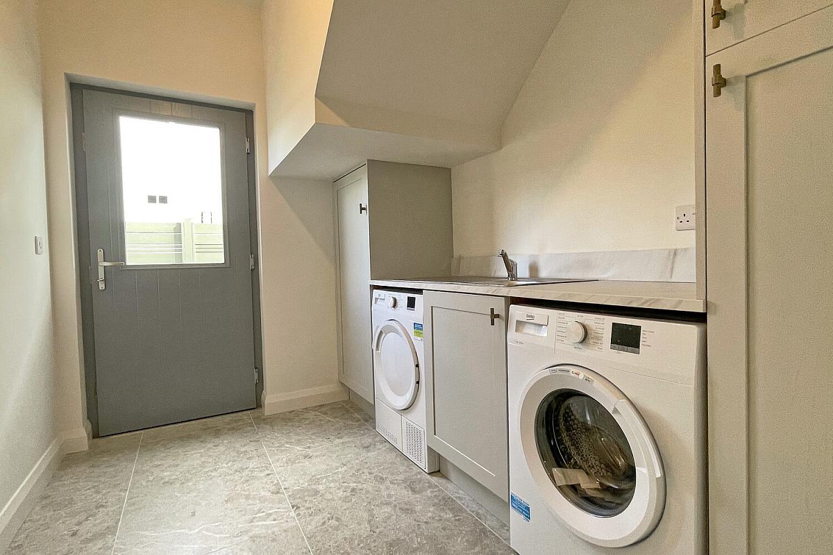 Range of contemporary fitted units; stainless steel sink unit; laminate work surfaces; washing machine & dryer; gas boiler; tiled floor; extractor fan; door to the side.