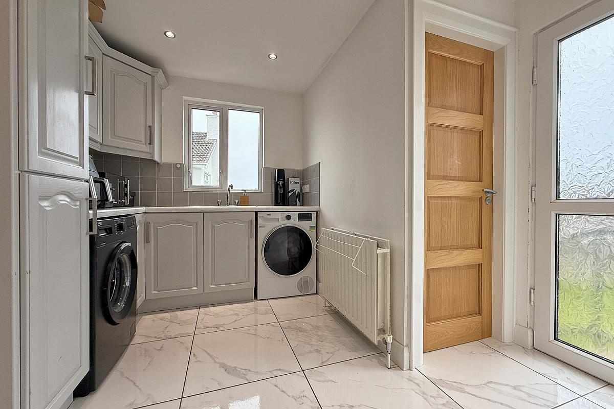 Range of fitted units; laminate work surfaces; stainless steel sink & drainer; plumbed for washing machine; space for dryer; separate WC with toilet; door to the rear; tiled floor; part tiled walls; recessed lighting; internal access to garage.