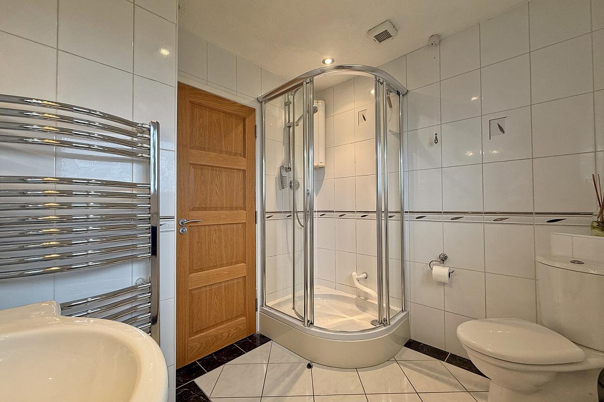 Tiled shower cubicle; toilet; vanity unit with wash hand basin & wall mounted mirror; chrome towel radiator; tiled floor; tiled walls.