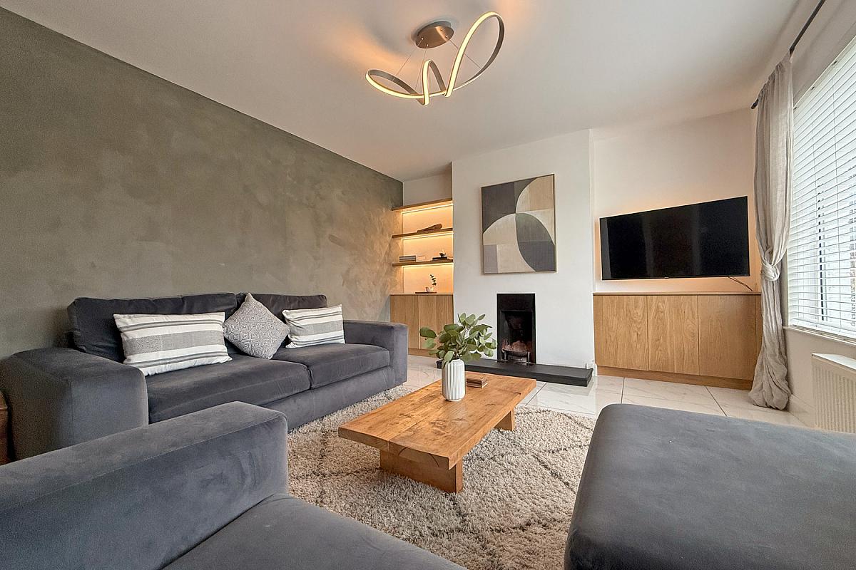 Cast iron fireplace set on a slate hearth; fitted Oak shelving with featured lighting; tiled floor.