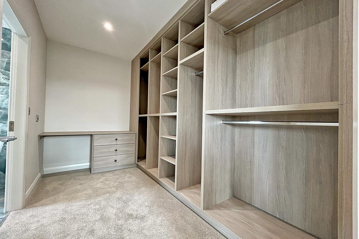 Extensive range of fitted units to include hanging space, shelving and drawers.