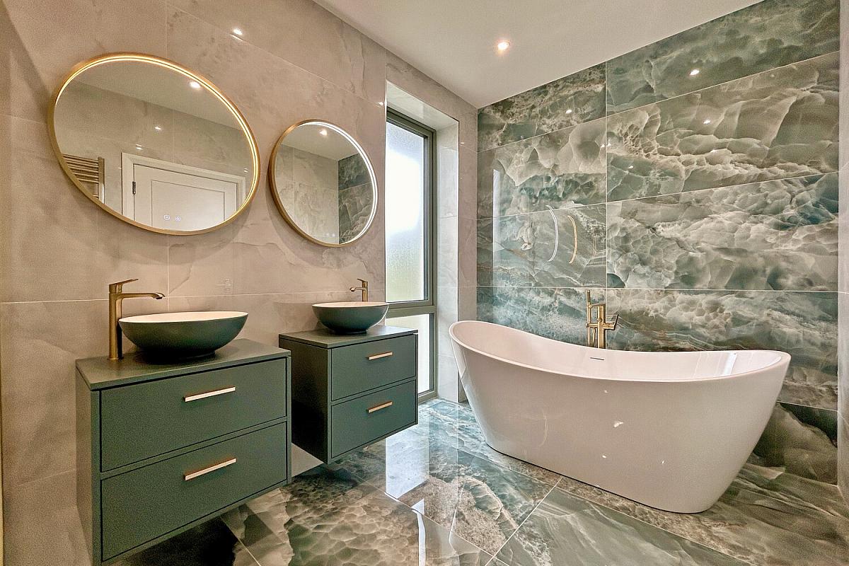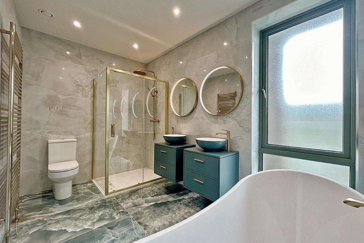 Freestanding bath; large tiled shower cubicle; twin vanity units with wash hand basins; toilet; towel radiator; tiled floor; tiled walls; spot lighting.