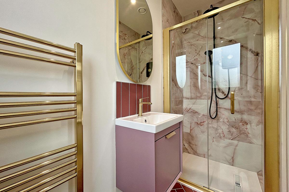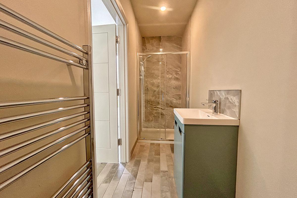 Tiled shower cubicle; toilet; wash hand basin; towel radiator; tiled floor.