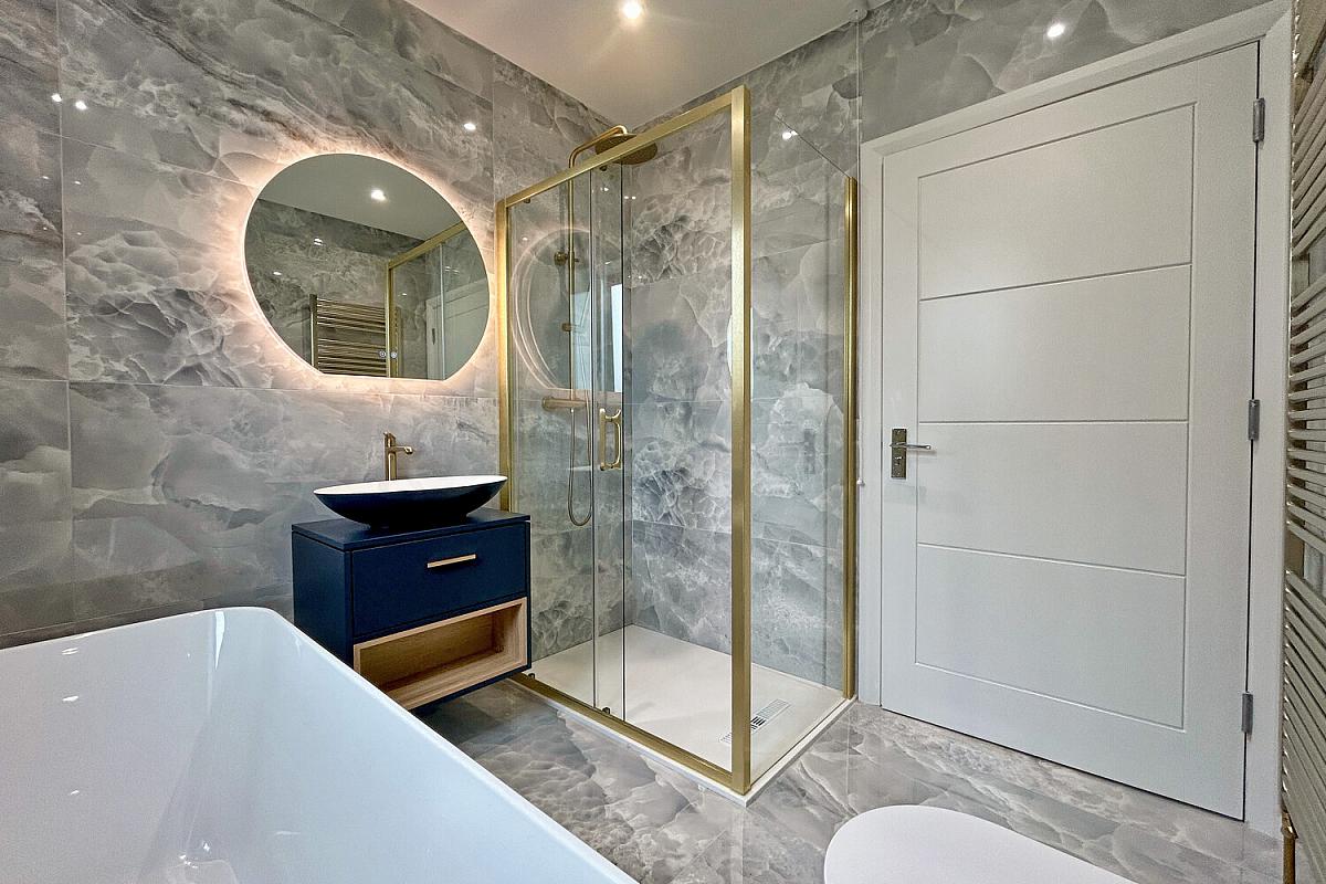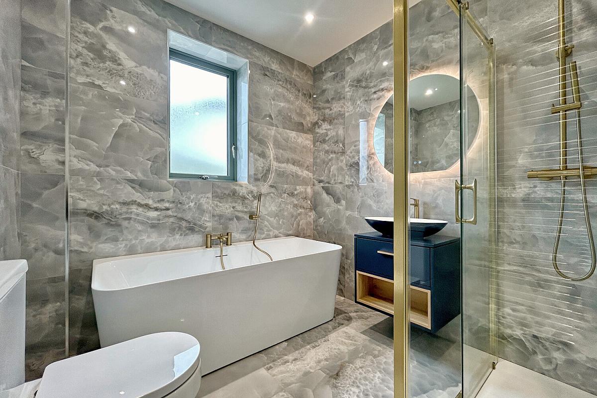 Freestanding bath with shower wand; large tiled shower cubicle; toilet; wall mounted vanity unit with wash hand basin; backlit mirror; tiled floor; tiled walls; spot lighting.