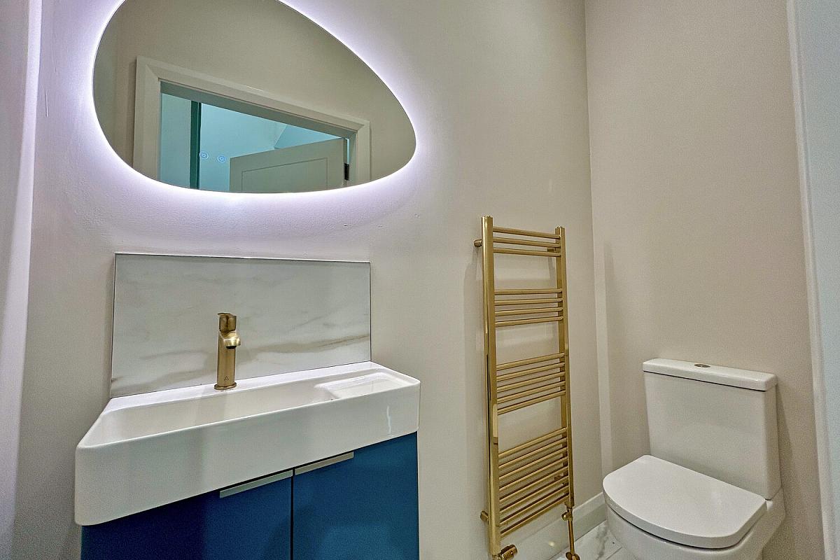Toilet; wall mounted vanity with wash hand basin; towel radiator; tiled floor; spot lighting.