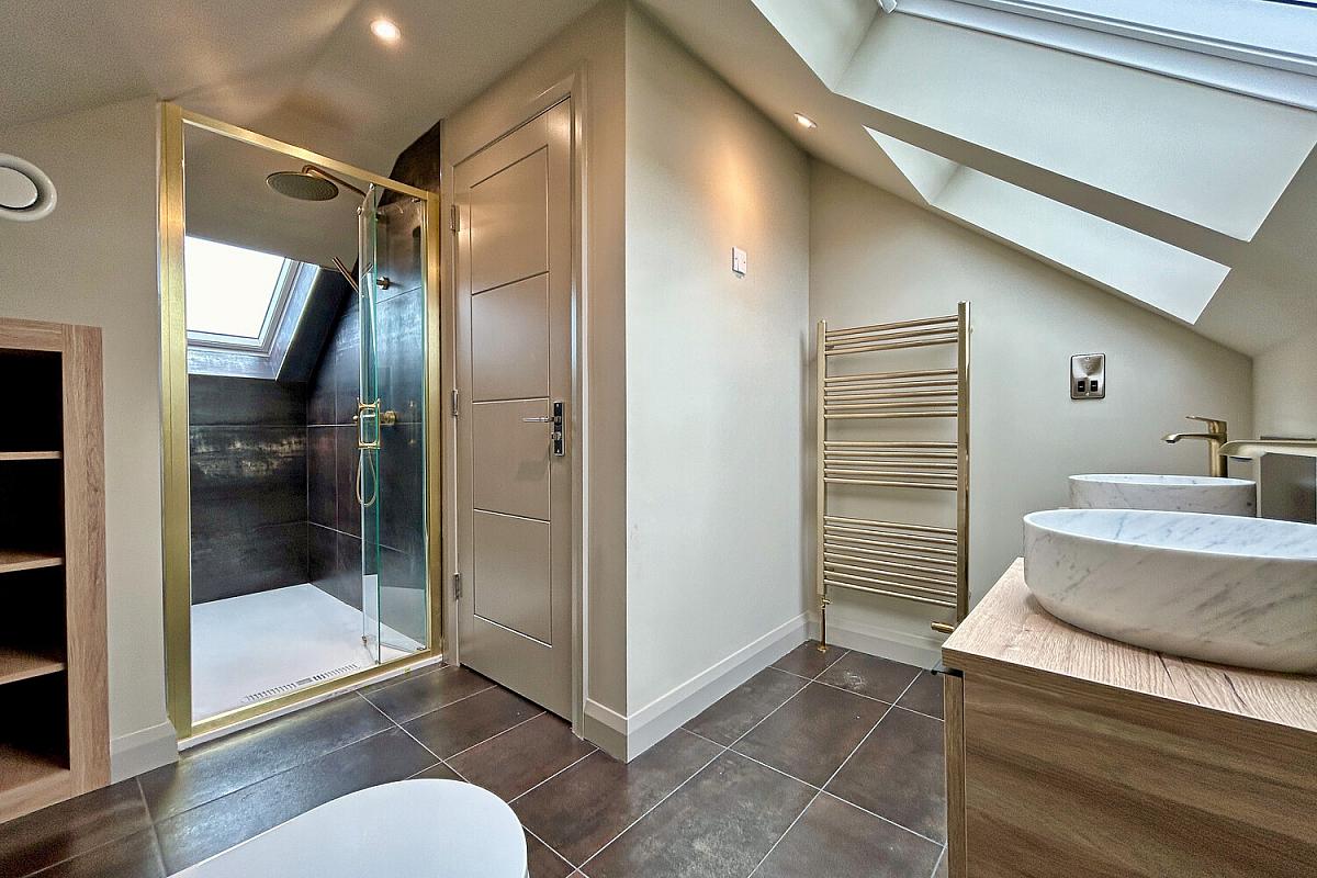 Large tiled walk in shower cubicle; toilet; twin wall mounted vanity units with wash hand basins; towel radiator; built in shelving; tiled floor.