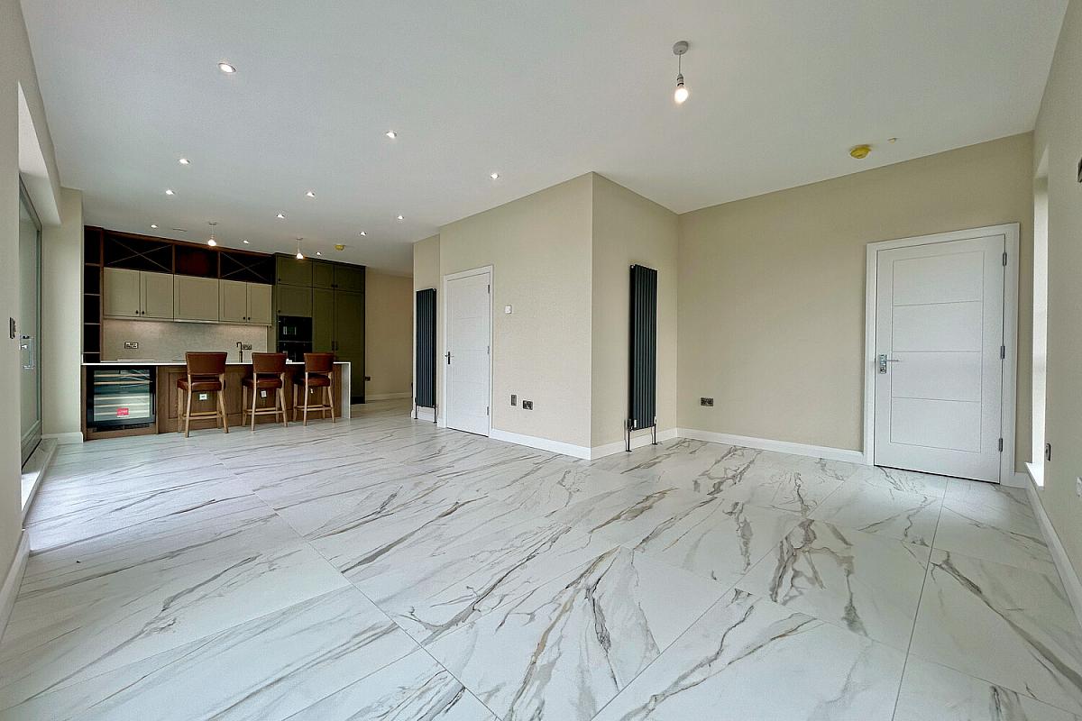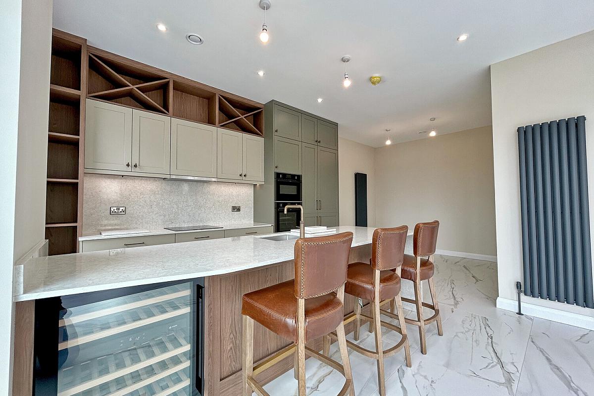 Luxury range of fitted units; quartz work surfaces; peninsula breakfast bar with recessed sink and Quooker tap; integrated wine cooler; Neff appliance to include fitted microwave, oven, dishwasher, induction hob and extractor unit; integrated Hotpoint fridge; tiled floor; spot lighting.