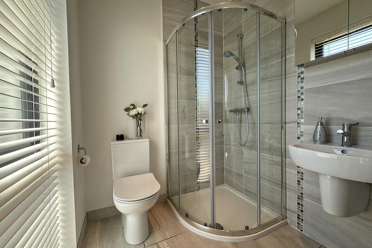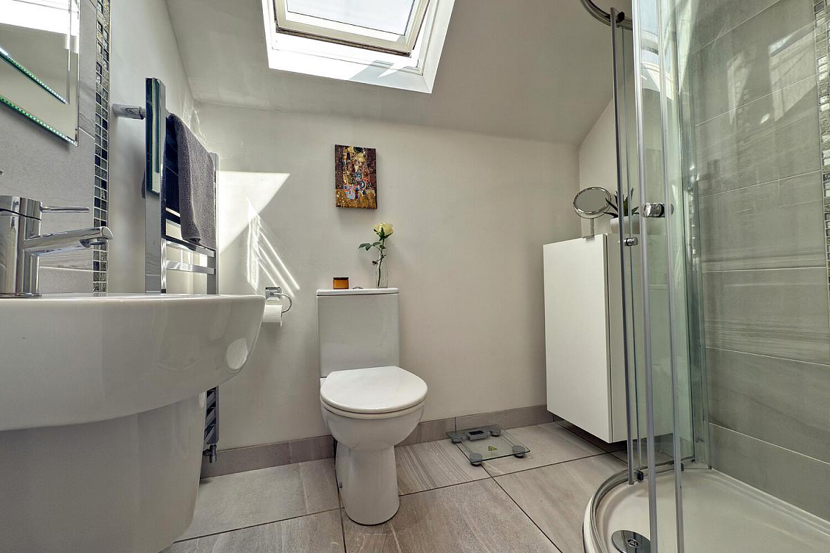 Tiled shower cubicle; toilet; wall mounted wash hand basin & vanity unit; chrome towel radiator; tiled floor; part tiled walls; recessed lighting; extractor fan.