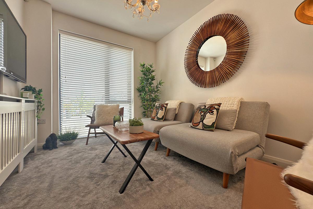 Feature wall length and corner windows bringing in natural light; wall mounted electric fire.
