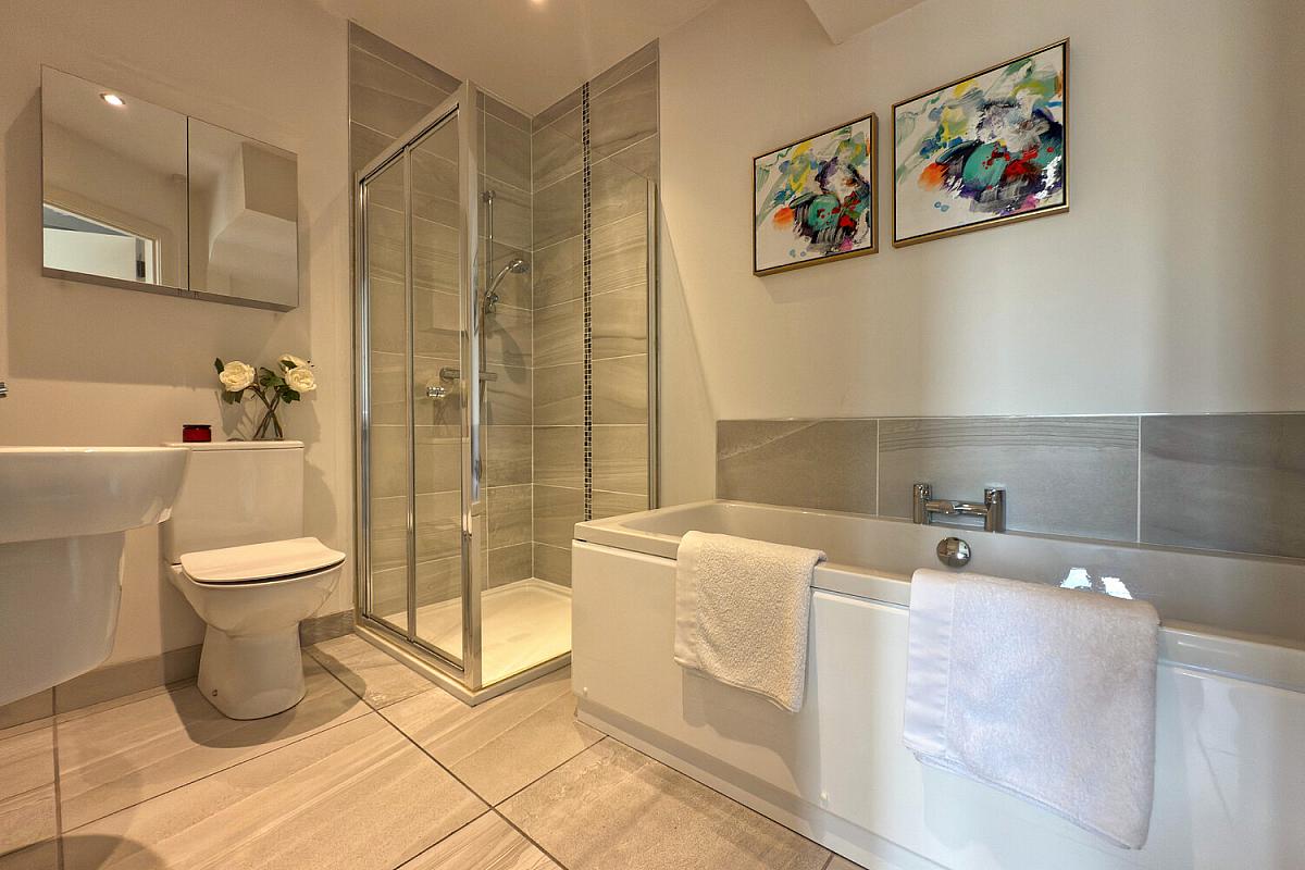 Panel bath; tiled shower cubicle; toilet; wall mounted wash hand basin & vanity unit; chrome towel radiator; recessed lighting; tiled floor; part tiled walls; extractor fan.