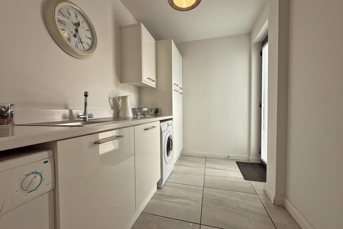 Range of fitted units; laminate work surfaces; stainless steel sink & drainer; plumbed for washing machine; space for dryer; tiled floor; extractor fan; door to the rear.