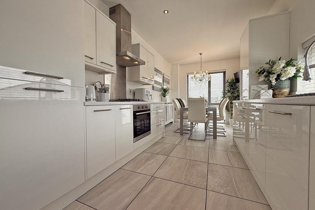 Range of fitted units; laminate work surfaces; stainless steel sink with pull spray attachment & drainer; electric oven; gas hob with extractor unit over; integrated fridge freezer & dishwasher; open to dining area; tiled floor; recessed lighting; gas boiler.