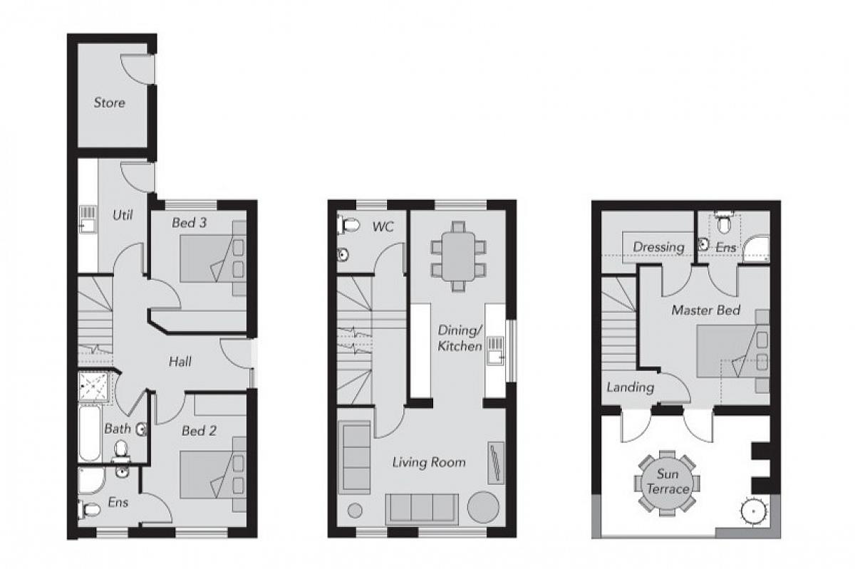 The ground floor features two double bedrooms (one with ensuite), a modern family bathroom and a utility room. The first floor boasts a bright open-plan kitchen, dining and living area with a separate WC. The top floor is dedicated to a stunning principal bedroom with ensuite, dressing room and access to a private west-facing terrace with an outdoor fireplace and coastal views.