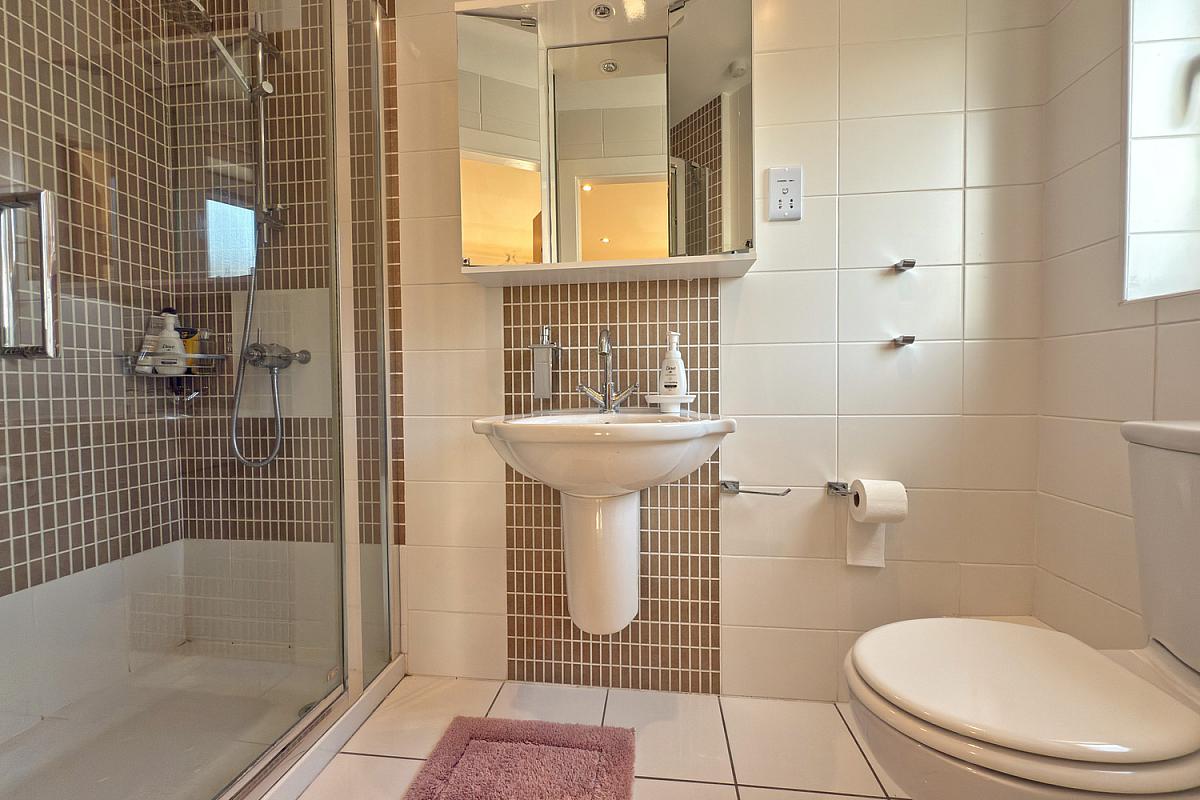 Large tiled shower cubicle; toilet; wall mounted wash hand basin & vanity unit; tiled floor & walls; recessed lighting.