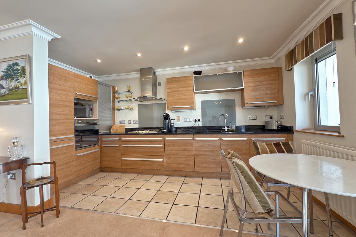 Range of fitted units; granite work surfaces; recessed sink & drainer; integrated fridge freezer; Smeg kitchen appliances to include integrated washing machine, dishwasher, fitted oven & gas hob with extractor unit over; tiled floor; recessed lighting; open to living & dining area.
